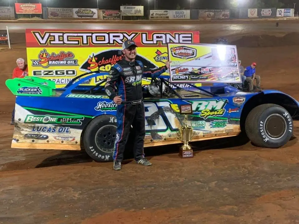 Riggs Motorsports driver, Tanner English of Benton, rolled into Victory Lane for the fifth time in 2021 at the Clarksville Speedway on Saturday with his dominating performance and a $10,053 victory.