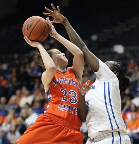 Michaela Manley went up against Tilghman’s Jalisa Smith in this basket attempt last week in the 1st Region Tournament.