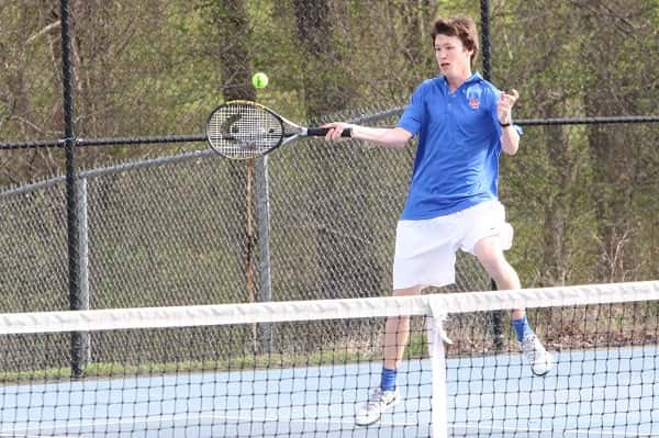 Conner Jones with a return in his win in singles against Calloway County last week.