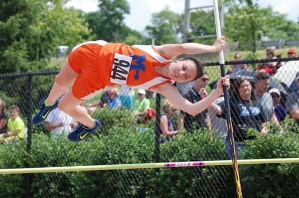 Sydney Temple clears the bar on her way to a 6th place finish in the pole vault at the KTCCCA Middle School State Track and Field Championships. Photo by KTCCCA