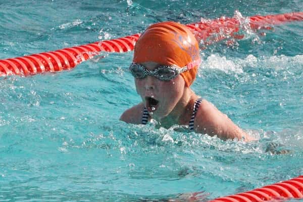 Zoe Lewis swimming the 25 yard breaststroke event in the Orange Waves home meet versus Madisionville.