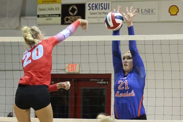 Marshall County’s Ragan Harris with the block on Calloway’s Lily Lowe in last weeks district semi-final.