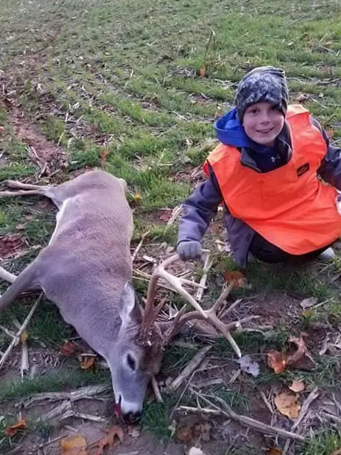 Conner Stom, 9 years old, with an 8 point buck, his first deer!