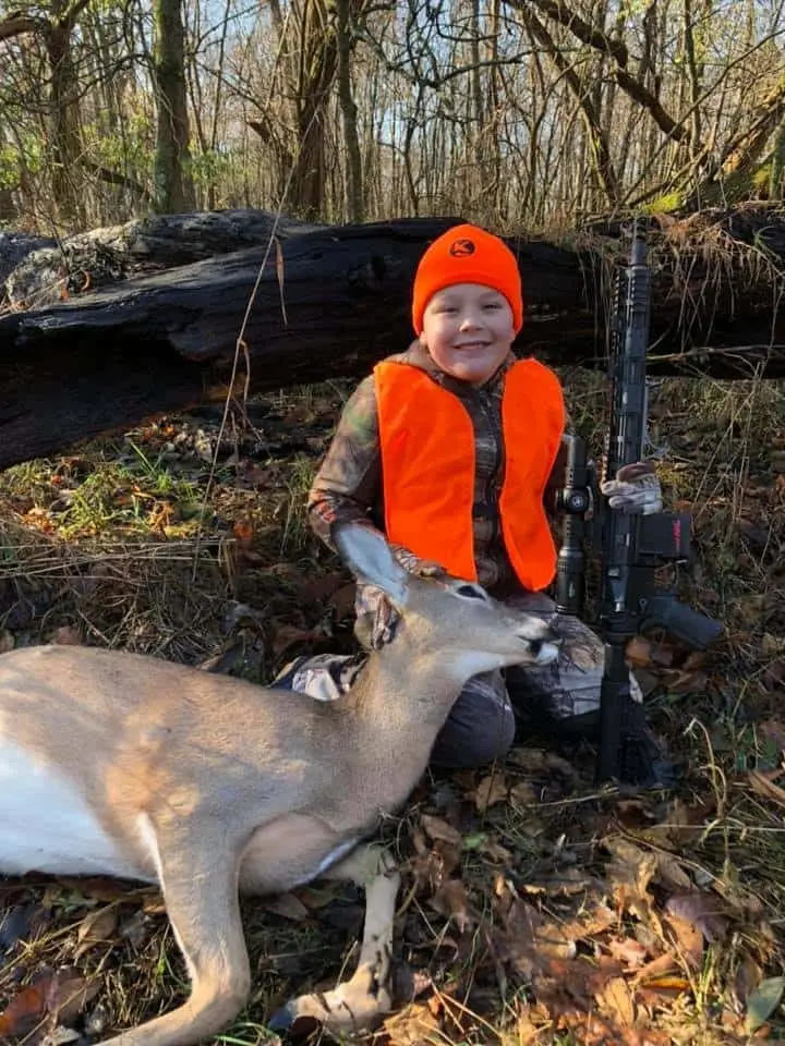 Kasen Lewzader, 9 years old, with his deer. He got the deer on a hunt with his dad, Jonathan, at 7:51 am Saturday morning on a farm in Todd County at 105 yards with a custom built Noveske rifle in 300 Blackout.
