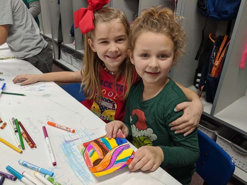 Benton Elementary (K-1) split including Brittany Ramage, Alicia Brophy, Mandy Miller and Misty Green had a day of STEAM activities. Students in the art activity with the guidance of Mrs. Kristen Bryant collaborated in groups to create Christmas themed mixed media artwork. Students within their groups were each given a section. The squares were then assembled in order to create a unifying whole. Students also learned about the process of printmaking by creating Christmas cards for loved ones.