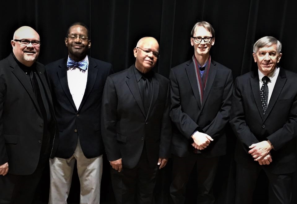 Pictured is The Jamey Aebersold Quartet backstage at the Jazz Festival in 2017. From left to right: Dr. Todd E. Hill (Murray State University), Tyrone Wheeler (bass), Jonathan Higgins (drums), Dr. Luke Gillespie (piano) and Jamey Aebersold (alto sax).