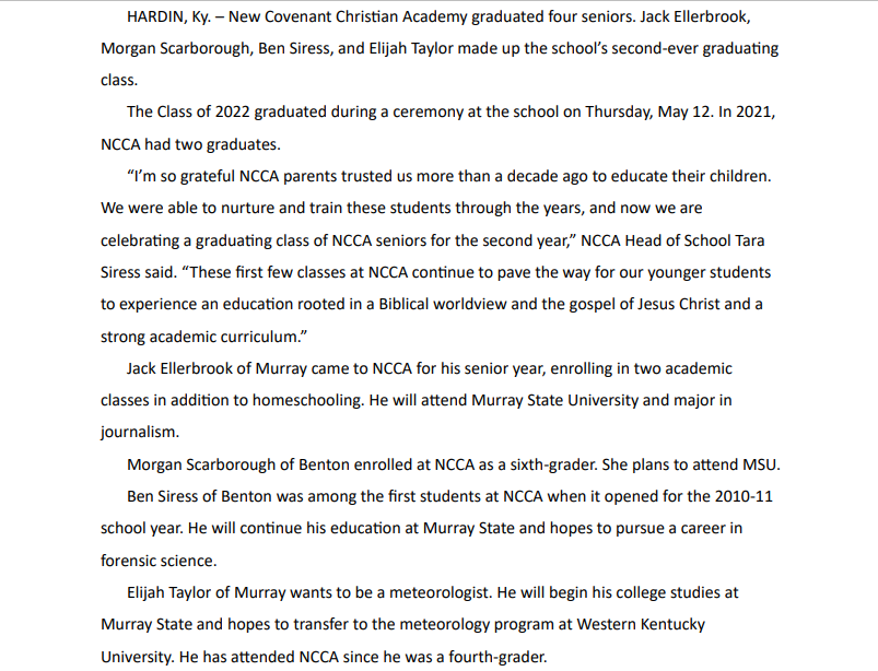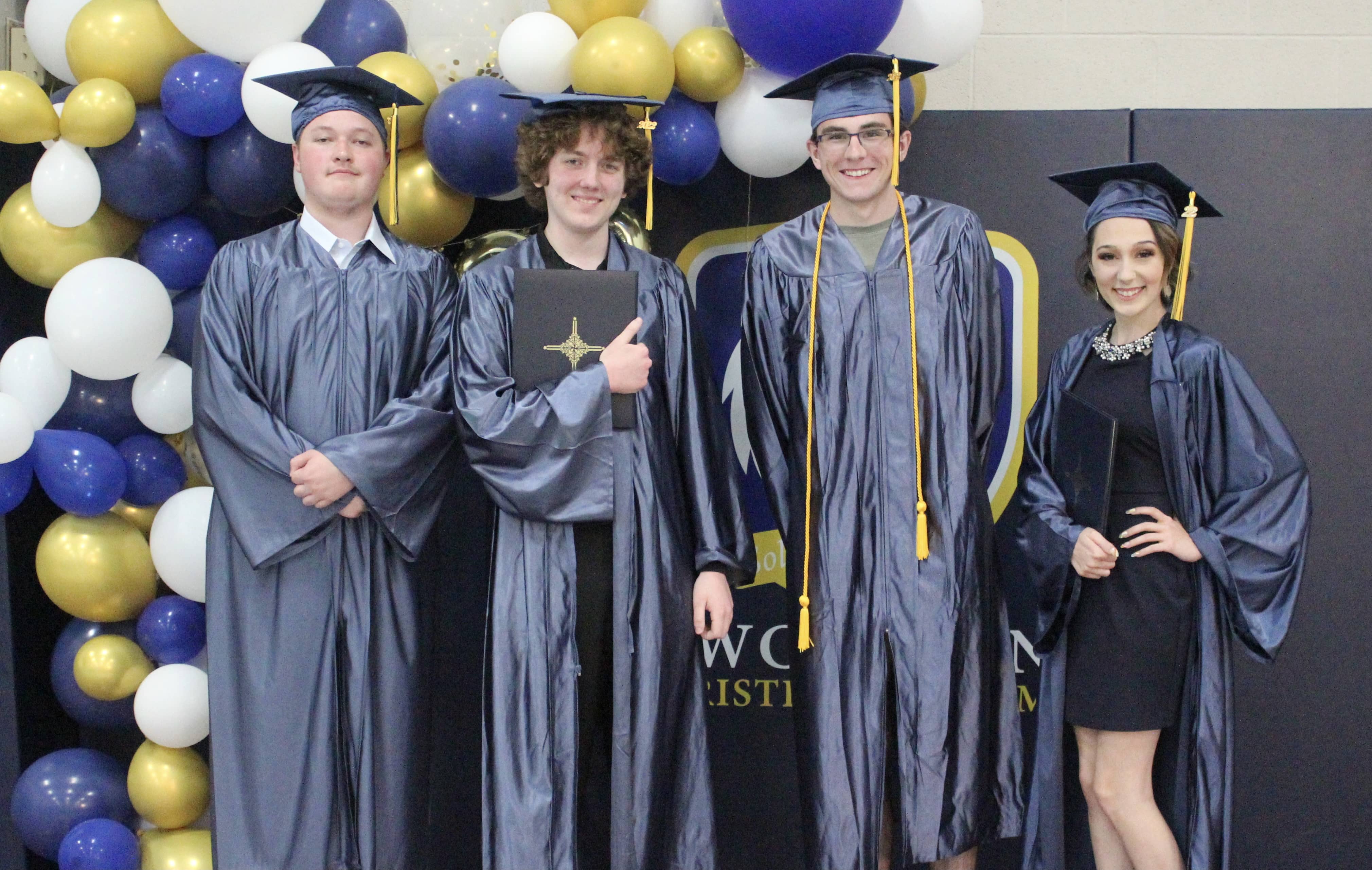 From left to right, Elijah Taylor, Jack Ellerbrook, Ben Siress and Morgan Scarborough celebrate their graduation from New Covenant Christian Academy on May 12.