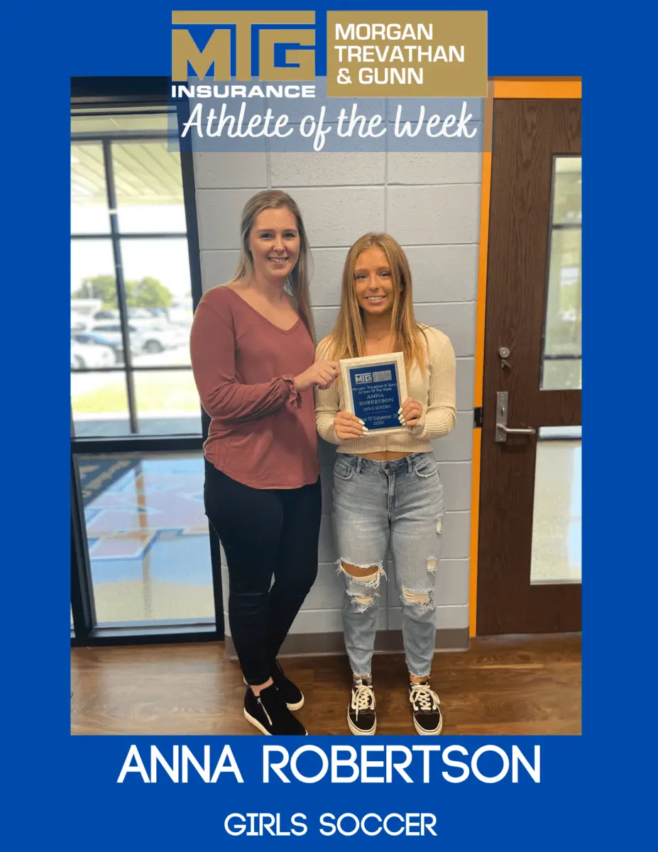 This week’s MTG Athlete of the Week is junior Lady Marshals soccer player Anna Robertson. In games last week, Anna scored one goal in their 6-0 win over Calloway County and had two goals and one assist in the 10-0 win over Mayfield.