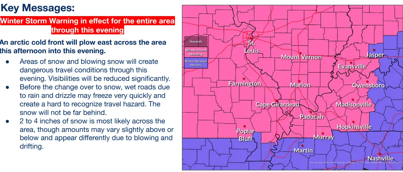 Motorists are advised to monitor the developing forecast via area news media outlets or go to the National Weather Service Louisville Office page at https://www.facebook.com/NWSPaducah. Graphics with the Winter Weather Warning can be found at https://www.weather.gov/media/pah/DssPacket.pdf.