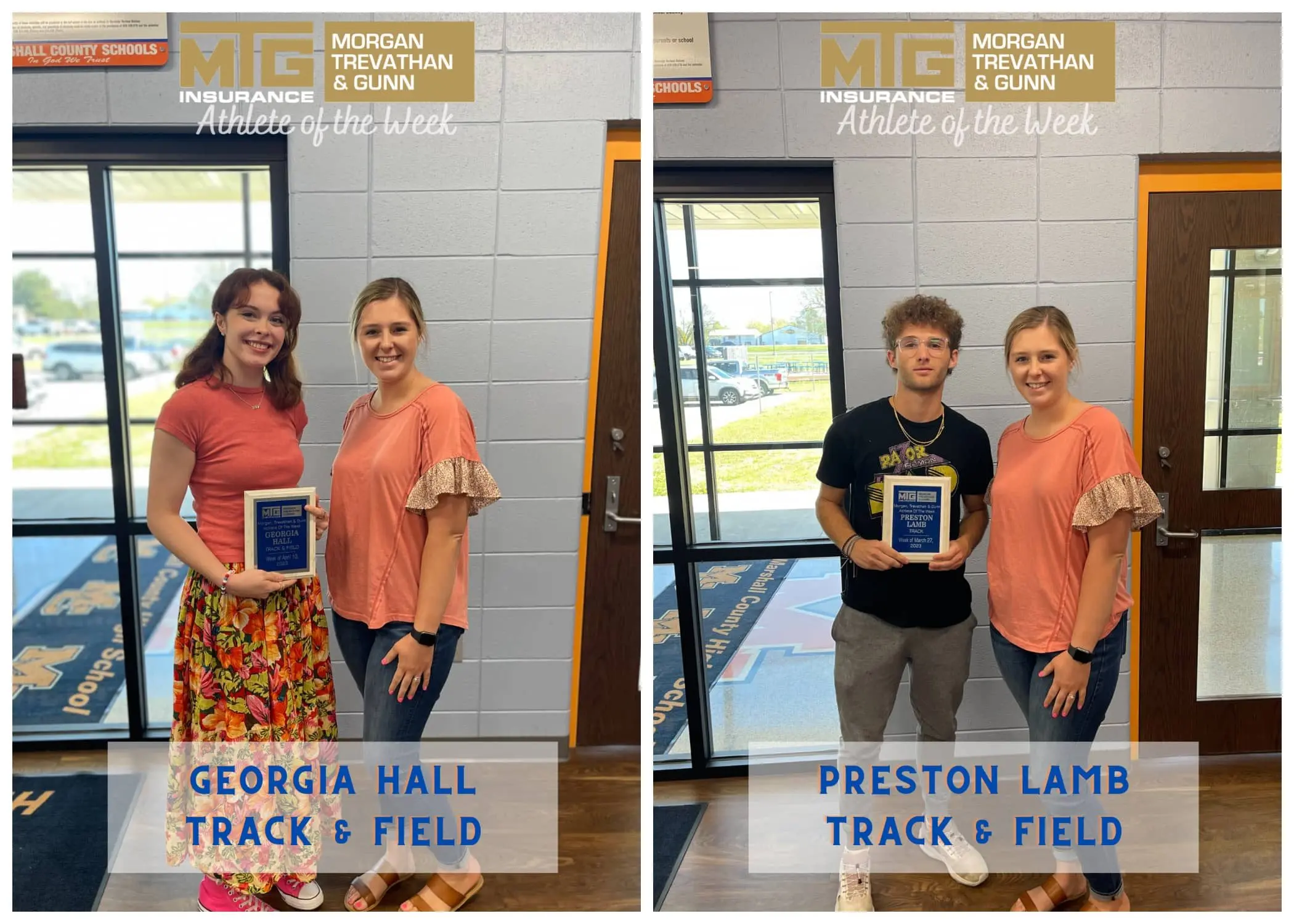 Track and field athletes, Georgia Hall and Preston Lamb, were selected MTG Insurance Athletes of the Week. Hall broke her own school record with a throw of 118-10 in discus at the Carterville Invitational at Carterville High School. Lamb took second in the 400 meters (51.55) and a member of two relay teams – the 4 x 400 and 4 x 800 – which placed second at the Marshall County Invitational of the South.