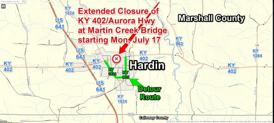 This extended closure of KY 402/Aurora Highway at the 8.71 mile point is to allow construction of a new bridge over Martin Creek. This closure is along KY 402/Aurora Highway in Hardin about halfway between the KY 905/Commerce Street intersection and the 4-Way Stop at the KY 1824/Murray Highway intersection.