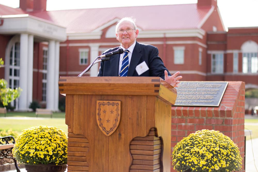 Dr. Gene W. Ray speaks in front of the Dr. Gene W. Ray Science Campus.