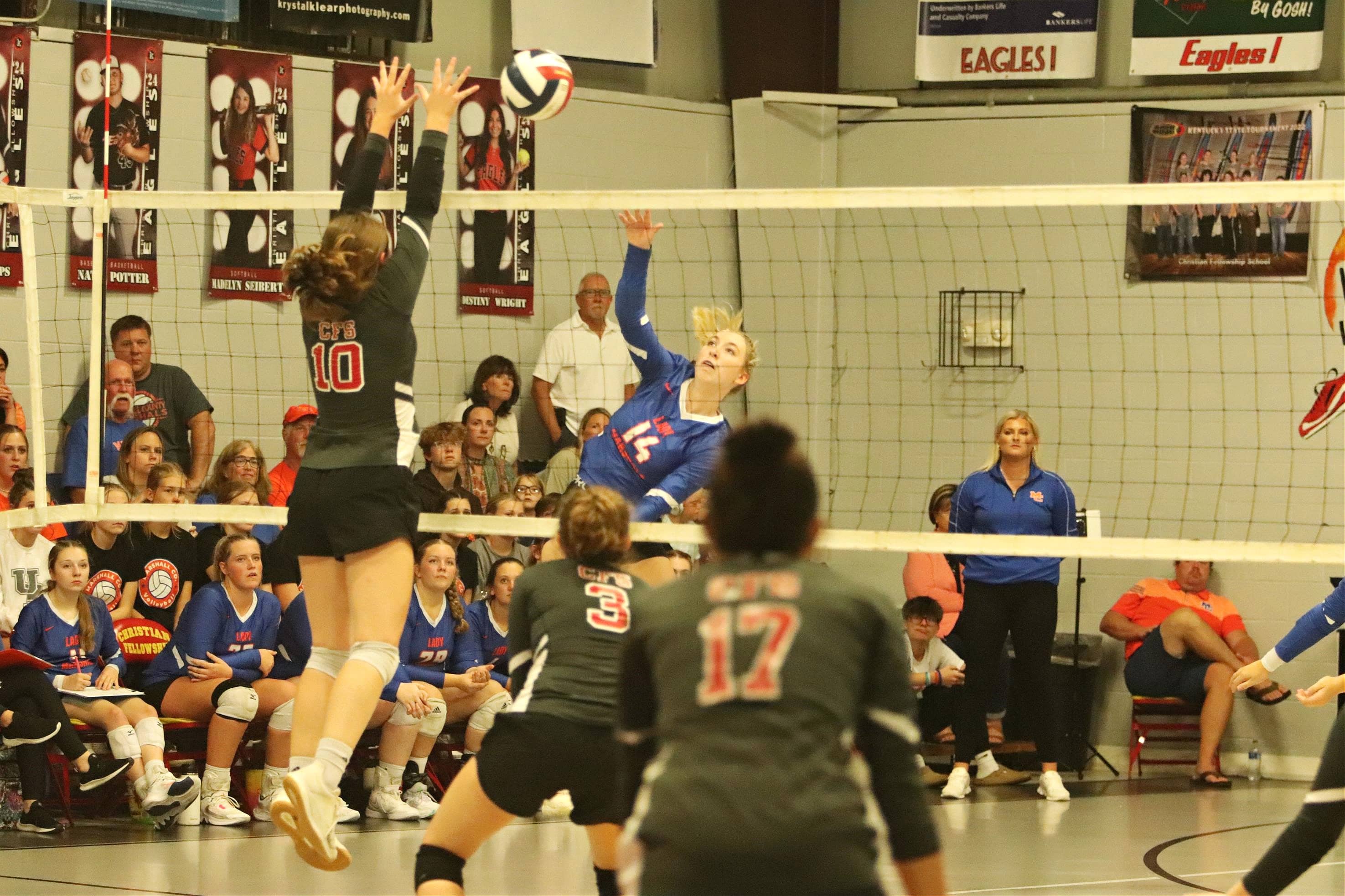 The first set was a sign of what was to come, with 11 ties and numerous lead changes. After the eighth tie of the match at 11-11, the Lady Marshals edged out a slight lead at 14-11 and took the largest lead of the set at 17-13. The Lady Eagles scored the next five straight points to take an 18-17 lead. A kill from Abby Belcher put the Lady Marshals back up 19-18. A kill from Ava Phillips put CFS up 23-21 and they went on to take set one 25-21.