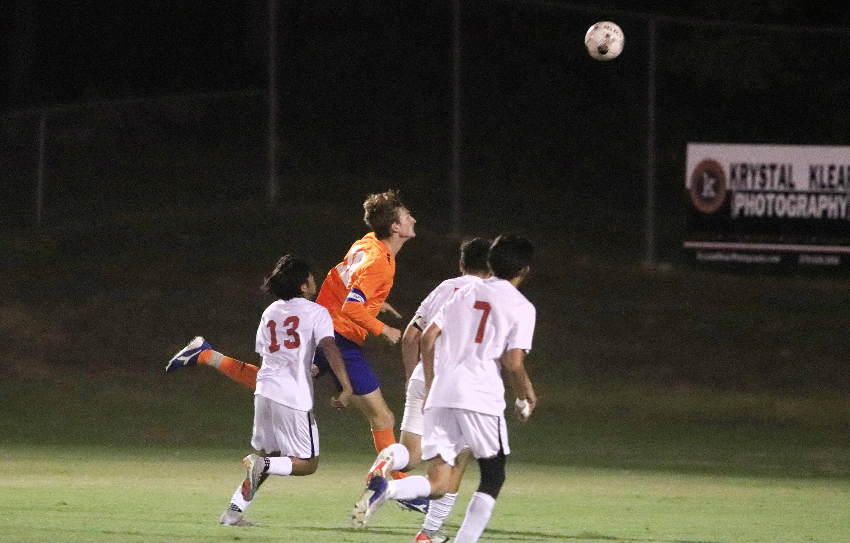Logan Parker scored the Marshals first goal of the game on this header in Tuesday’s 5-1 district semi-final win over Mayfield.