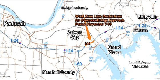 PADUCAH, Ky. (November 3, 2023) – A contractor for the Kentucky Transportation Cabinet (KYTC) plans a work zone lane restriction along a section of Interstate 24 in Marshall County starting Tuesday, November 7, 2023.