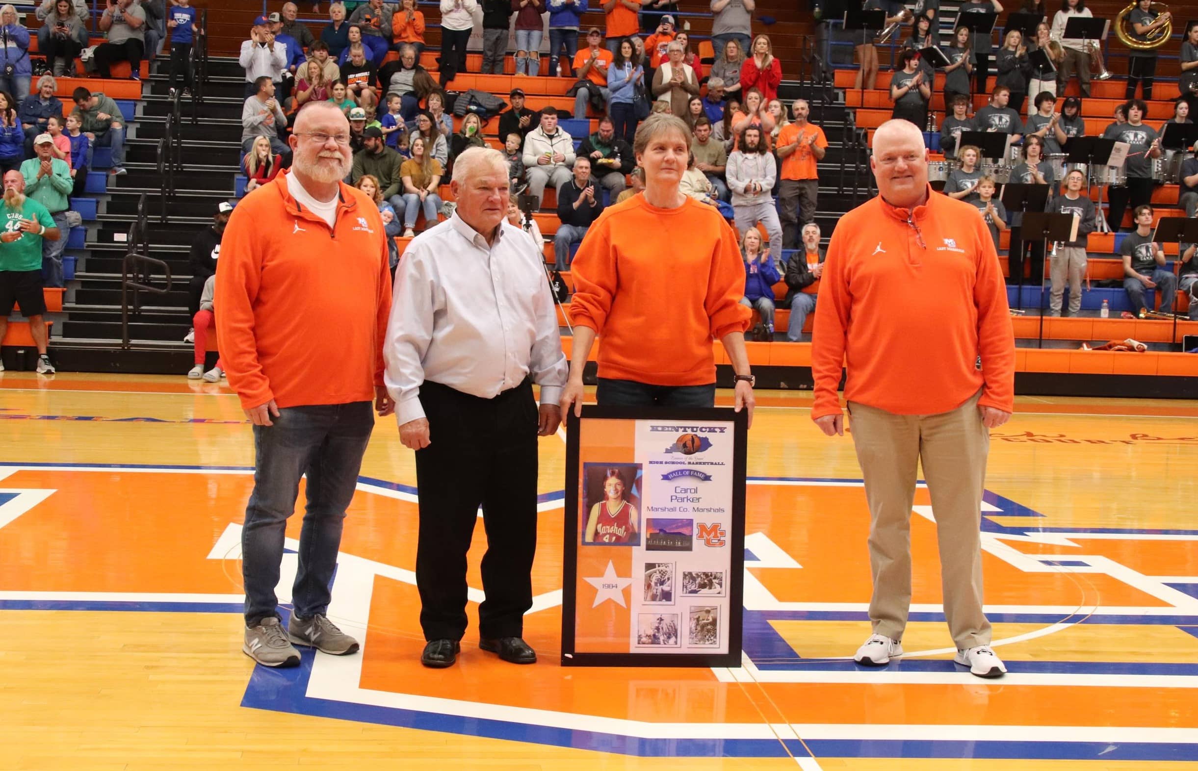 Friday between games of the Marshall County double-header against Graves County, former Lady Marshals star basketball player, Carol Parker, was recognized for her induction into the Kentucky High School Basketball Hall of Fame.