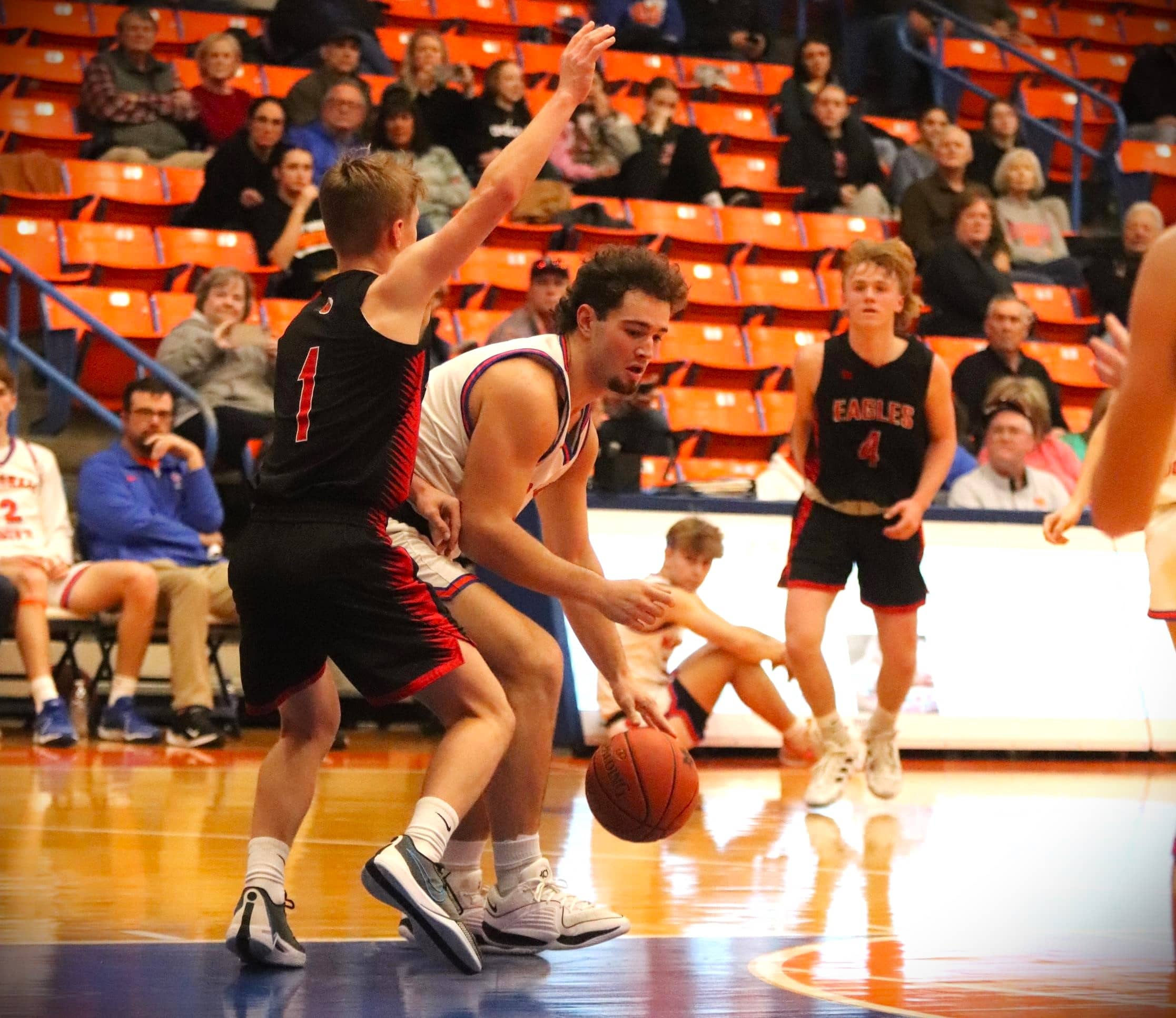 Threes began falling for the Eagles in the third quarter and they cut a once 40-point deficit at 69-29 down to 27 points at 69-42 after a 13-0 run. Samuel Grigg hit two three pointers and Elijah Grigg and Jakin Burnett each had one to help close the gap. The quarter ended on a long buzzer-beater by Kannon Dunn for a 72-42 Marshall County lead.
