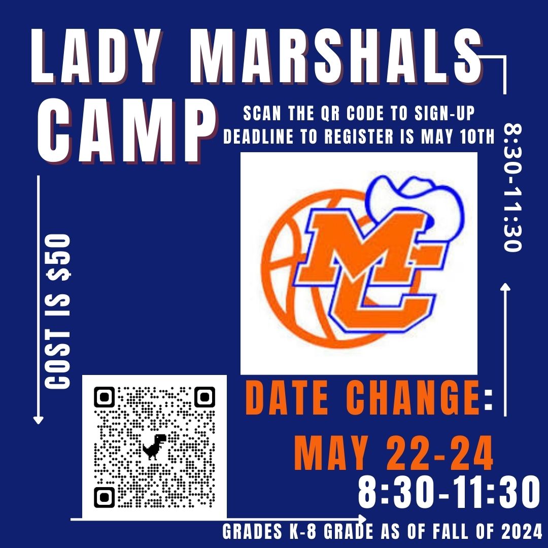 The Lady Marshals annual basketball camp for grades kindergarten through eighth (as of fall 2024) will take place May 22-24 from 8:30-11:30 each. day. Deadline to sign up is May 10. The cost of the camp is $50 and will be due on the first day of camp. Scan the QR code to access the registration page.