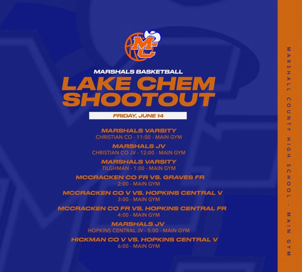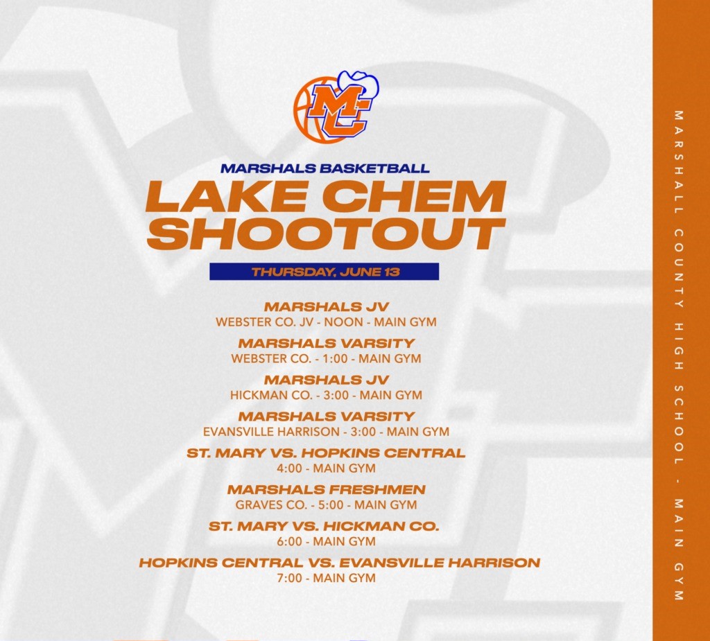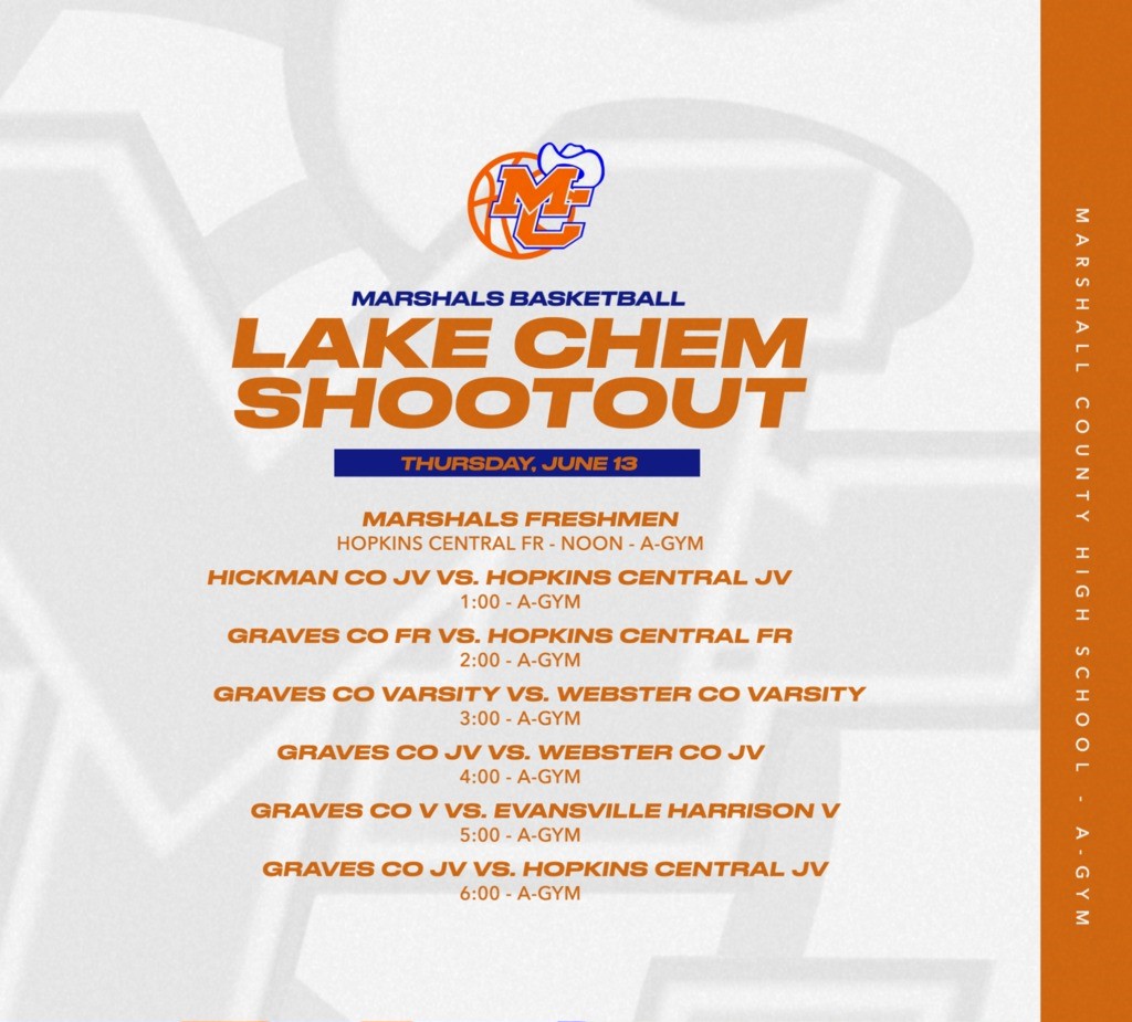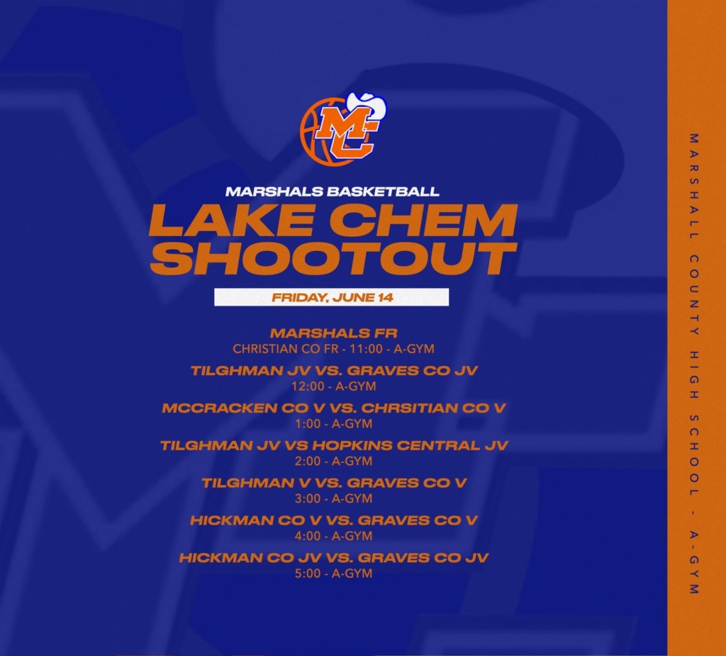 The Marshals Basketball Team is hosting the Lake Chem Shootout Thursday, June 13 and Friday, June 14. See photos below for the schedule for games played at Marshall County High School. Cost is $5 at the door and concessions will be sold at all gyms.