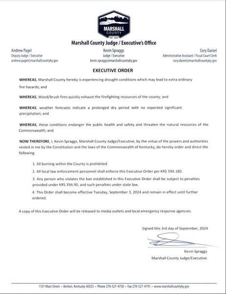 Marshall County Judge/Executive Kevin Spaggs has issued a burn ban for Marshall County due to the drought conditions. All burning within the county is prohibited until further notice.