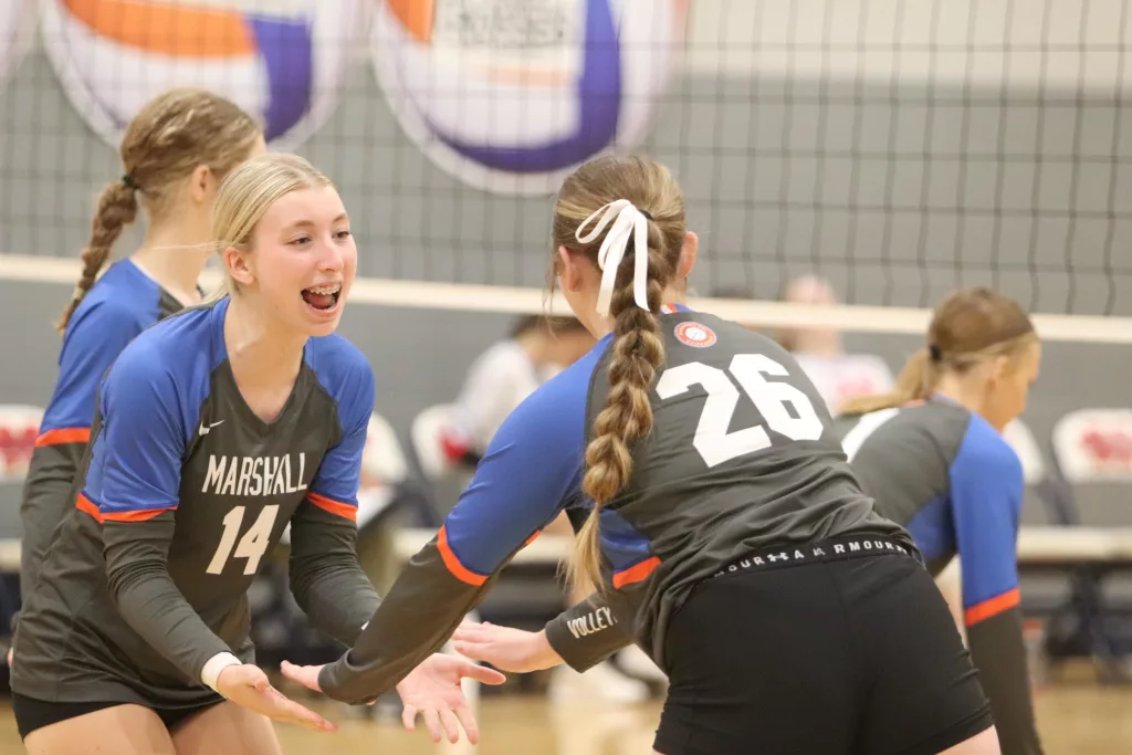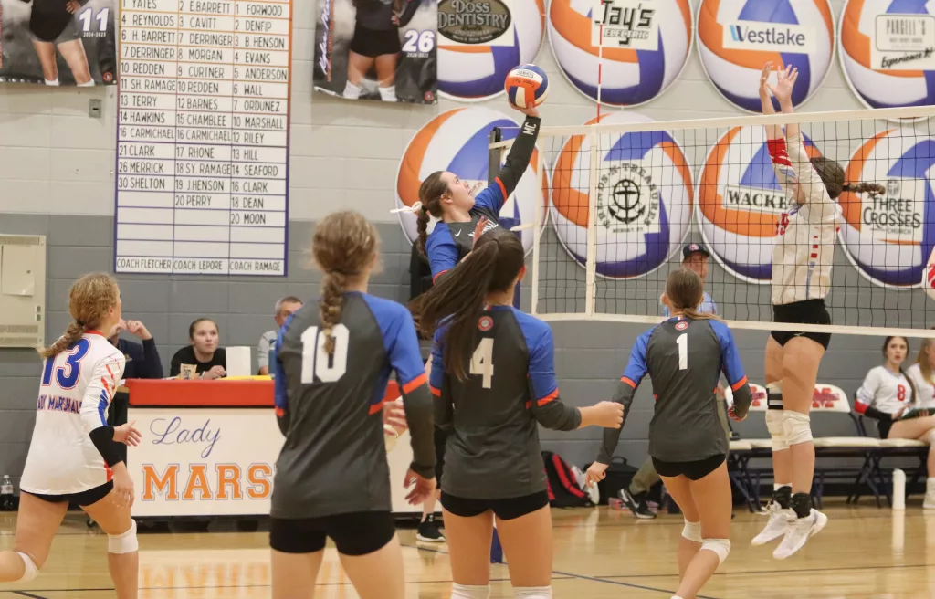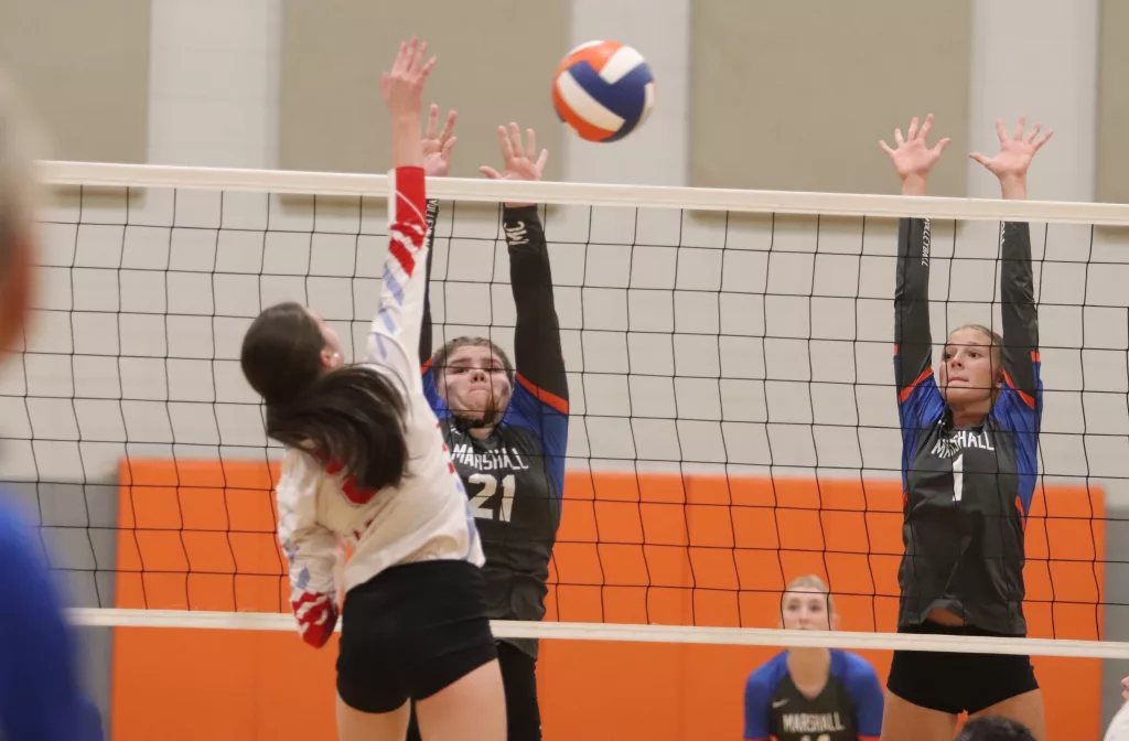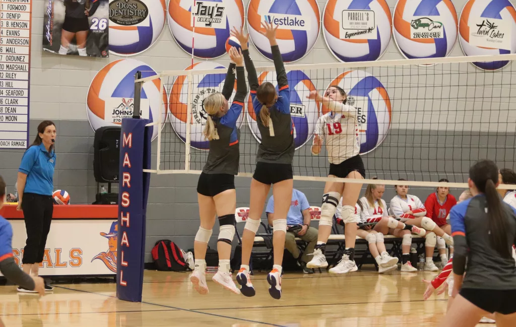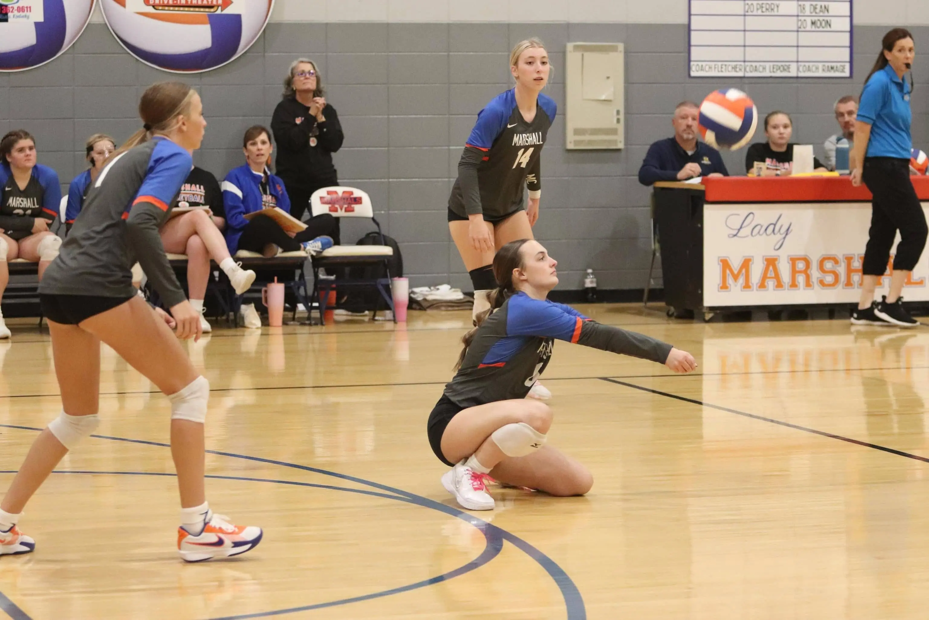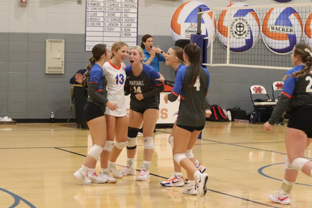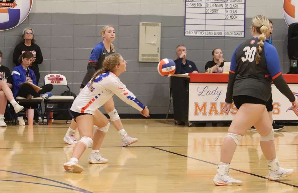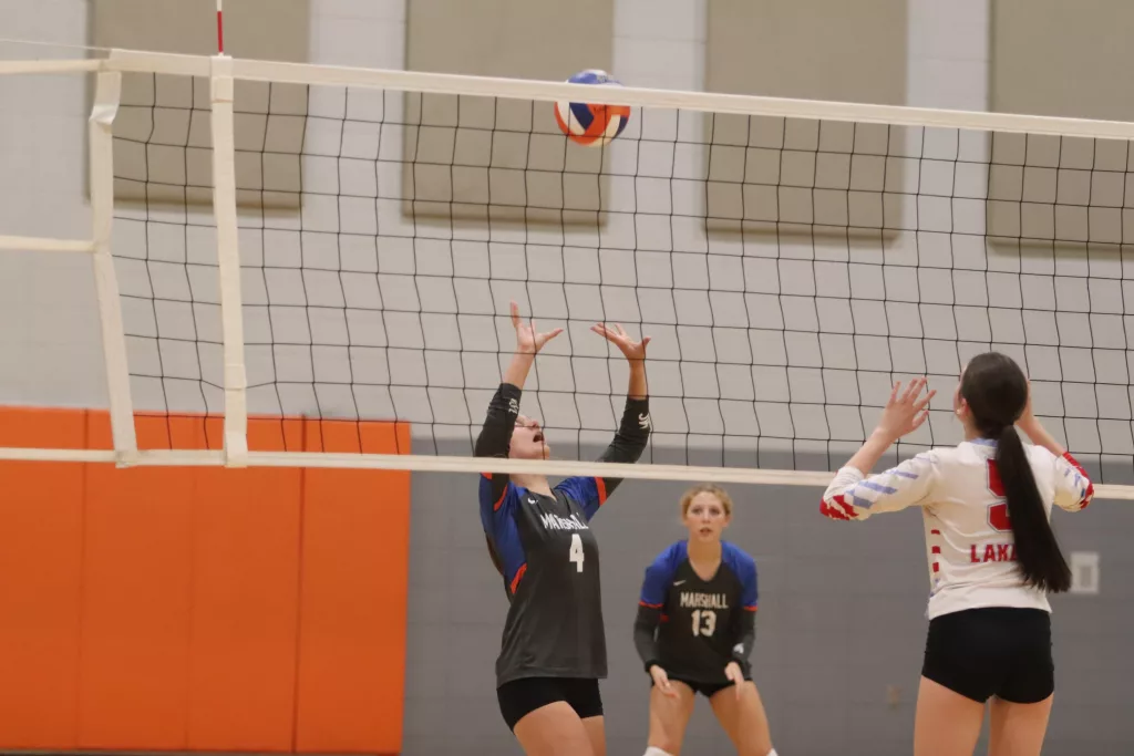 The Lady Marshals held a 13-7 lead in the first set but the Lady Lakers tied it up at 13 behind the serves of Cambrey Driscoll. The set was knotted up again at 18 a piece before the Lady Marshals nudged ahead at 21-20 on a kill by Catherine Shelton. They went on to take set one 25-22 on a perfectly placed kill by freshman Bella Redden.