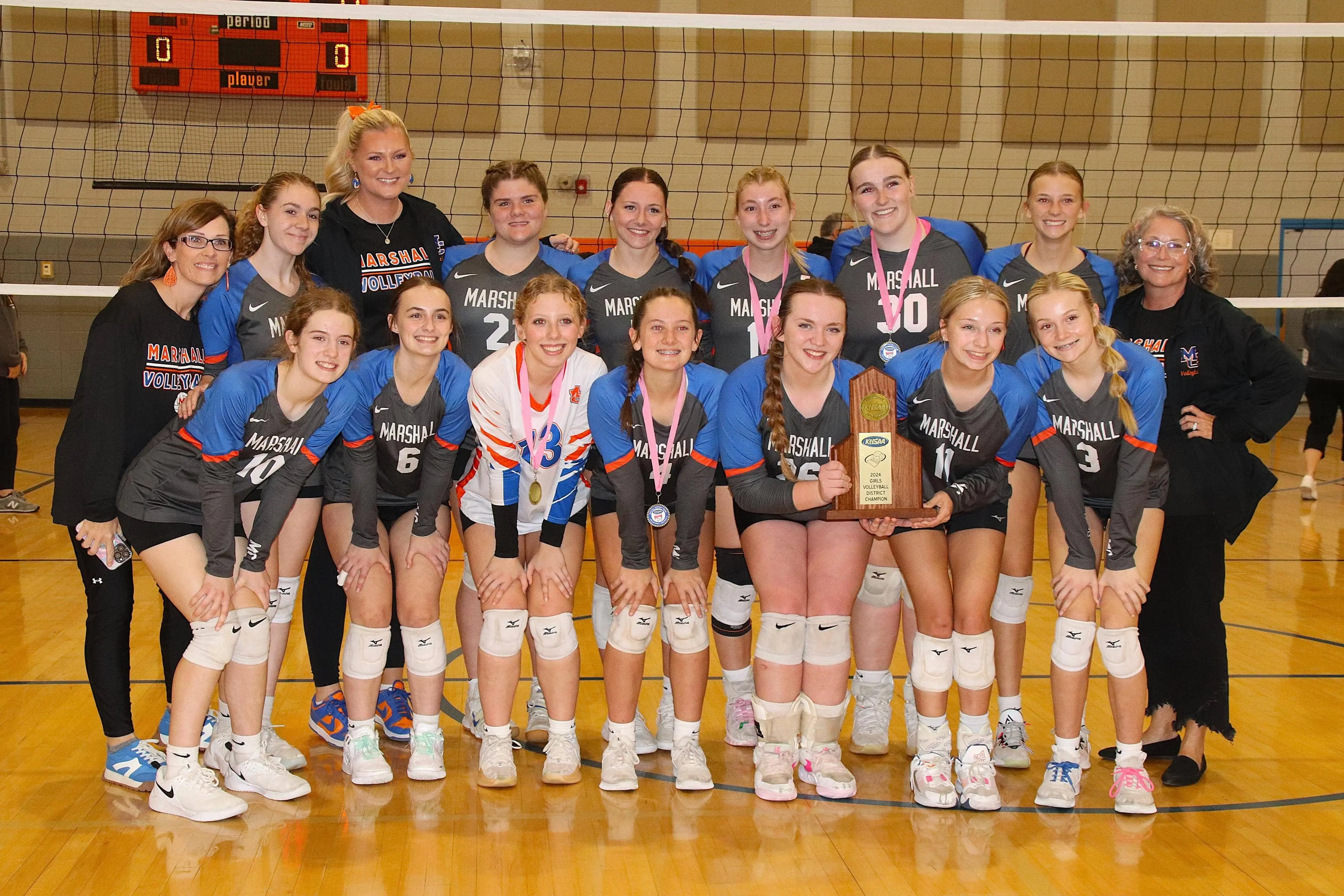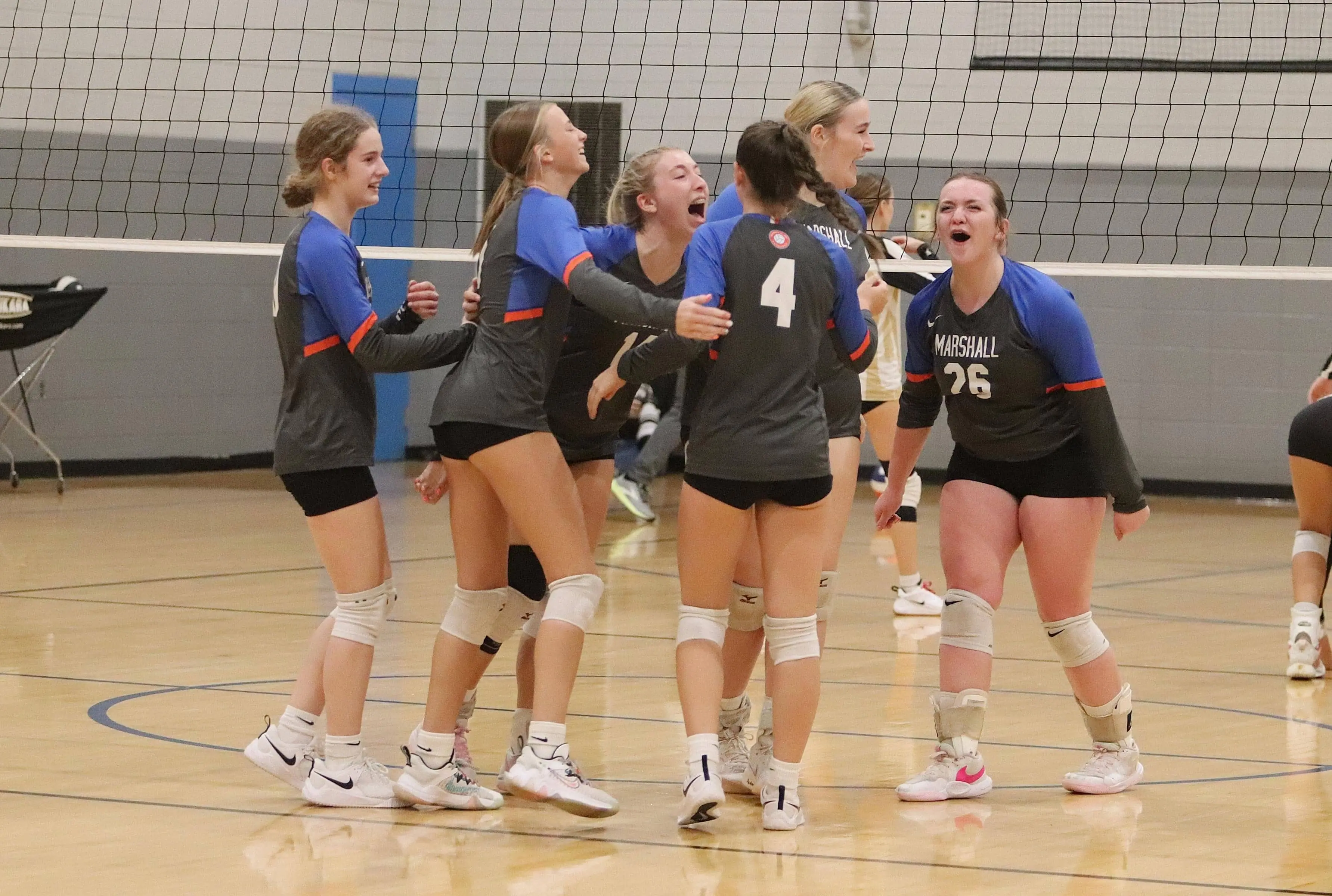 Four more ties followed before the Lady Marshals began to pull away, gaining momentum on consistent serving from Emma Reynolds and Merrick. They finished out the 25-15 first set win on two straight kills by Catherine Shelton and Bella Redden.