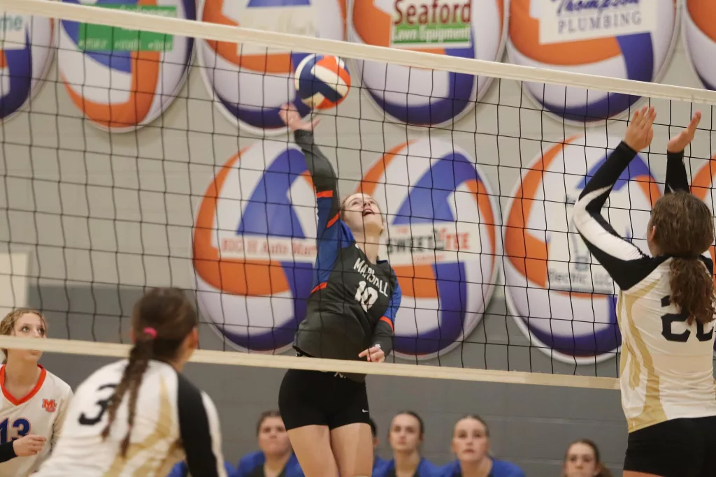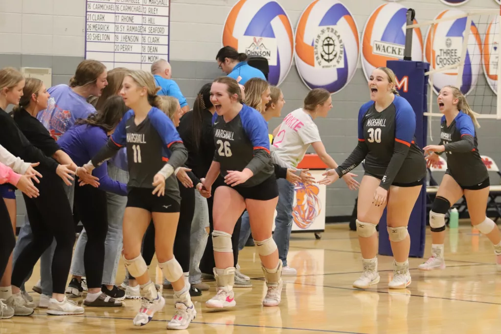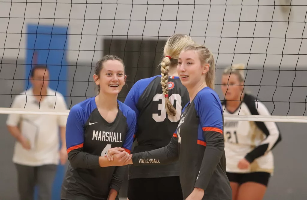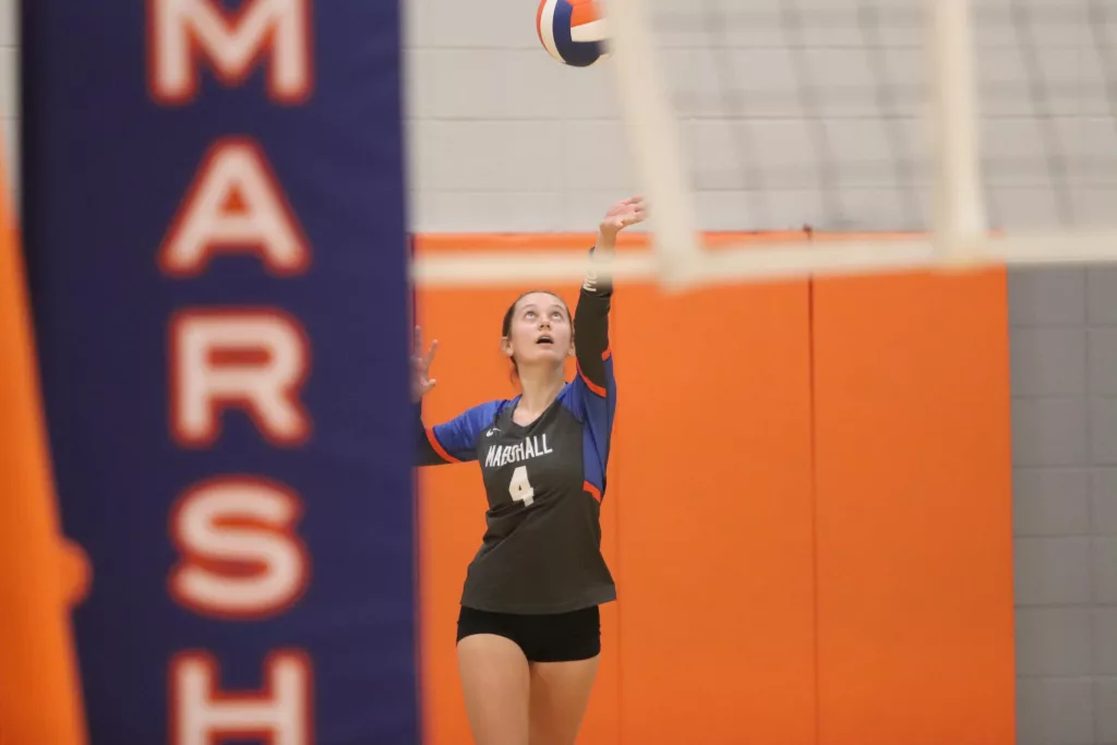 Four more ties followed before the Lady Marshals began to pull away, gaining momentum on consistent serving from Emma Reynolds and Merrick. They finished out the 25-15 first set win on two straight kills by Catherine Shelton and Bella Redden.
