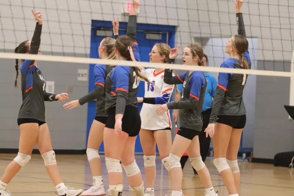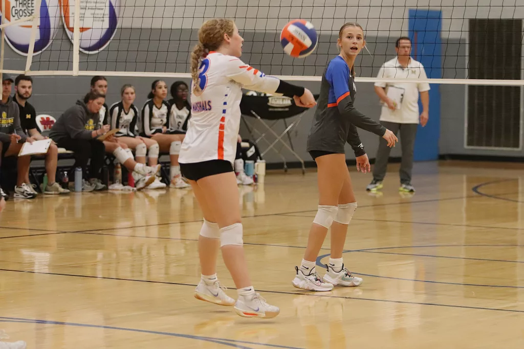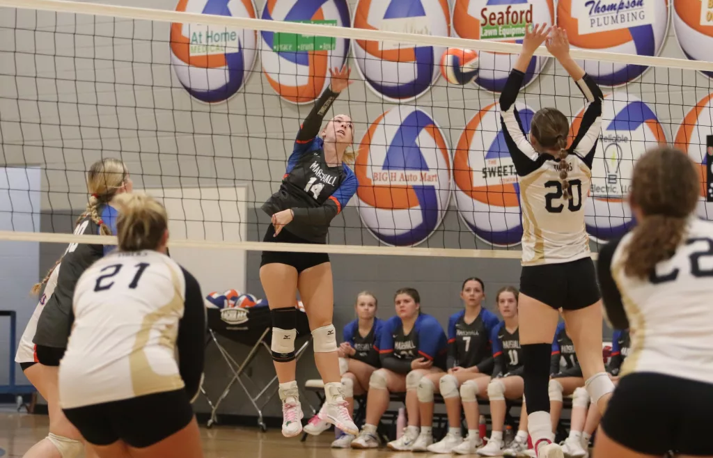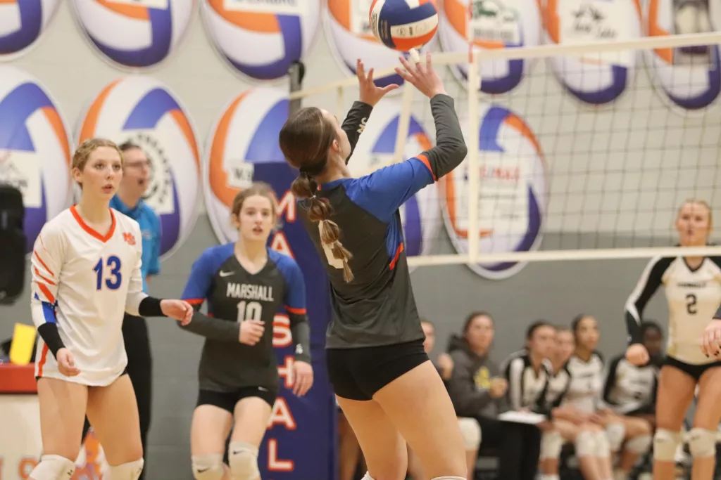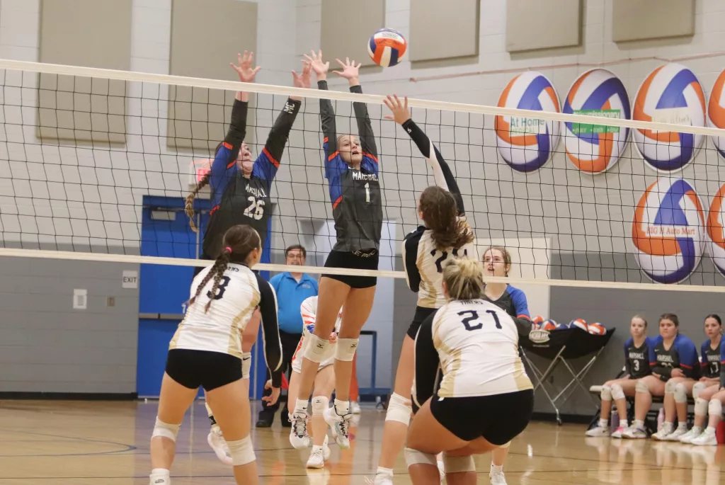Four more ties followed before the Lady Marshals began to pull away, gaining momentum on consistent serving from Emma Reynolds and Merrick. They finished out the 25-15 first set win on two straight kills by Catherine Shelton and Bella Redden.