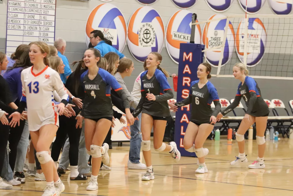 A run of four straight points followed for the Lady Marshals with the final point to close out the 25-18 set win coming on an ace by Merrick to give them a 2-0 lead in the match.