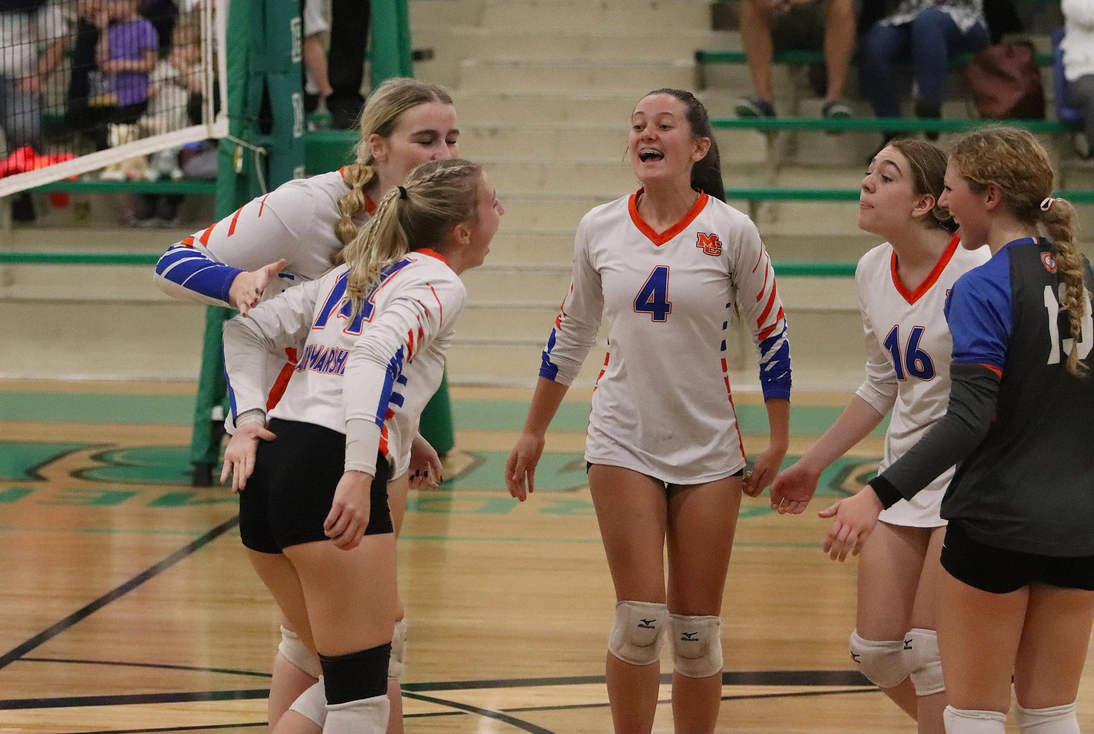 The Lady Marshals celebrate a hard earned point against CCA in Tuesday’s five-set match.The Lady Marshals held a slight lead in set one before CCA’s Lauren Fugate knotted it up at 15 on a successful kill. Six more ties in the set were highlighted by an ace by Laney Yates and kills from Olivia Hawkins and Kylie Merrick. Merrick’s kill broke a 25-25 tie and the Lady Marshals went on to win set one 27-25 on an ace by Bella Redden.