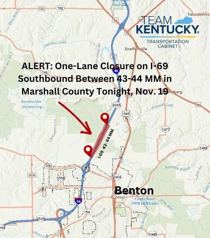PADUCAH, Ky. (Nov. 19, 2024) – I-69 Southbound will be restricted to one lane between 43 and 44 MM in Marshall County starting at 7 p.m. CST, tonight, Nov. 19 to repair a bridge deck.