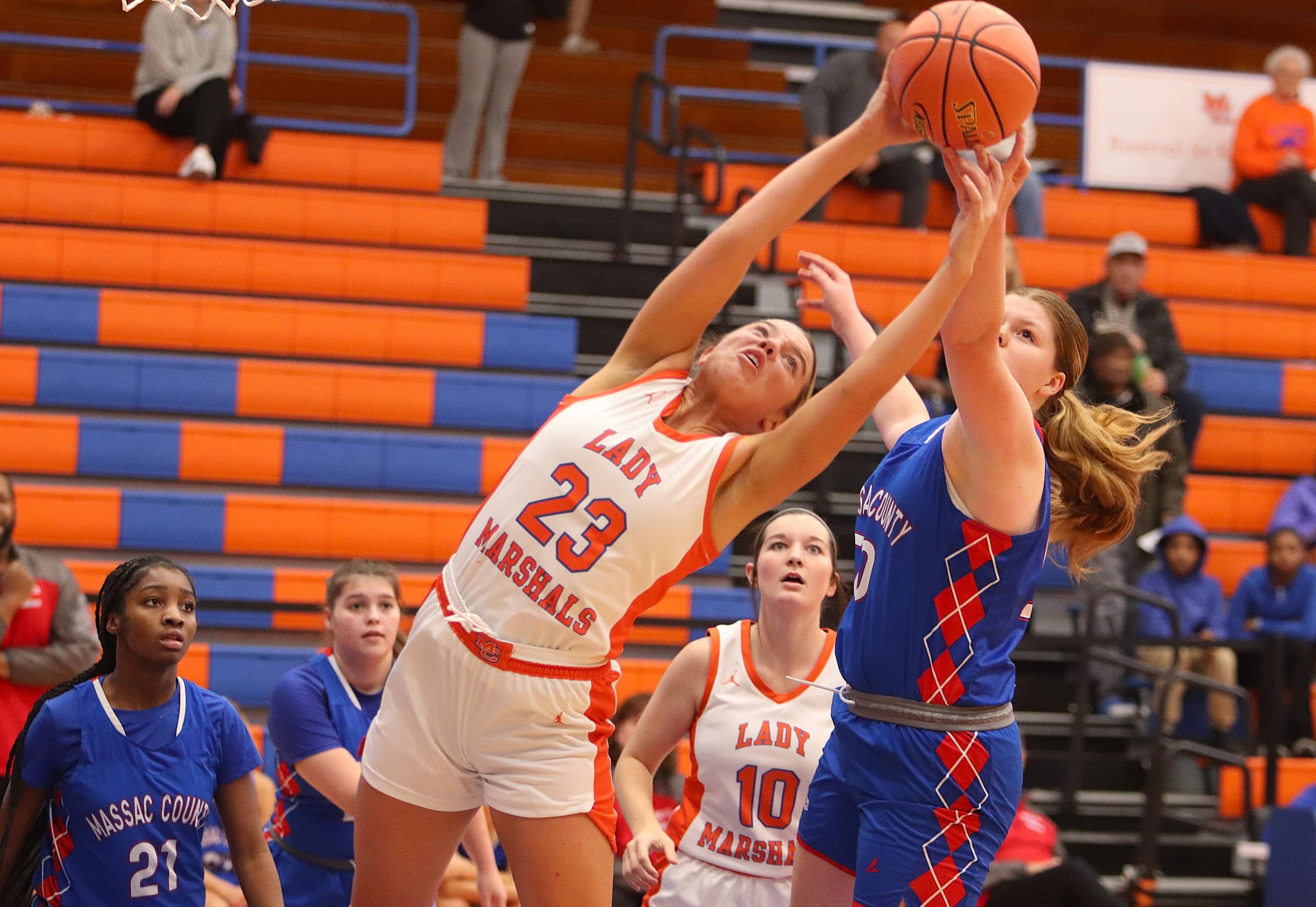 Massac County’s Lydia McCraw scored the opening basket of the game but the first of five 3-pointers in the game from senior Skylar Waller followed and the Lady Marshals would go on to outscore the Lady Patriots 26-3 to take a 29-5 lead at the end of the first quarter. Terry scored 13 and Waller had 11 and the duo dropped in three 3-pointers each.