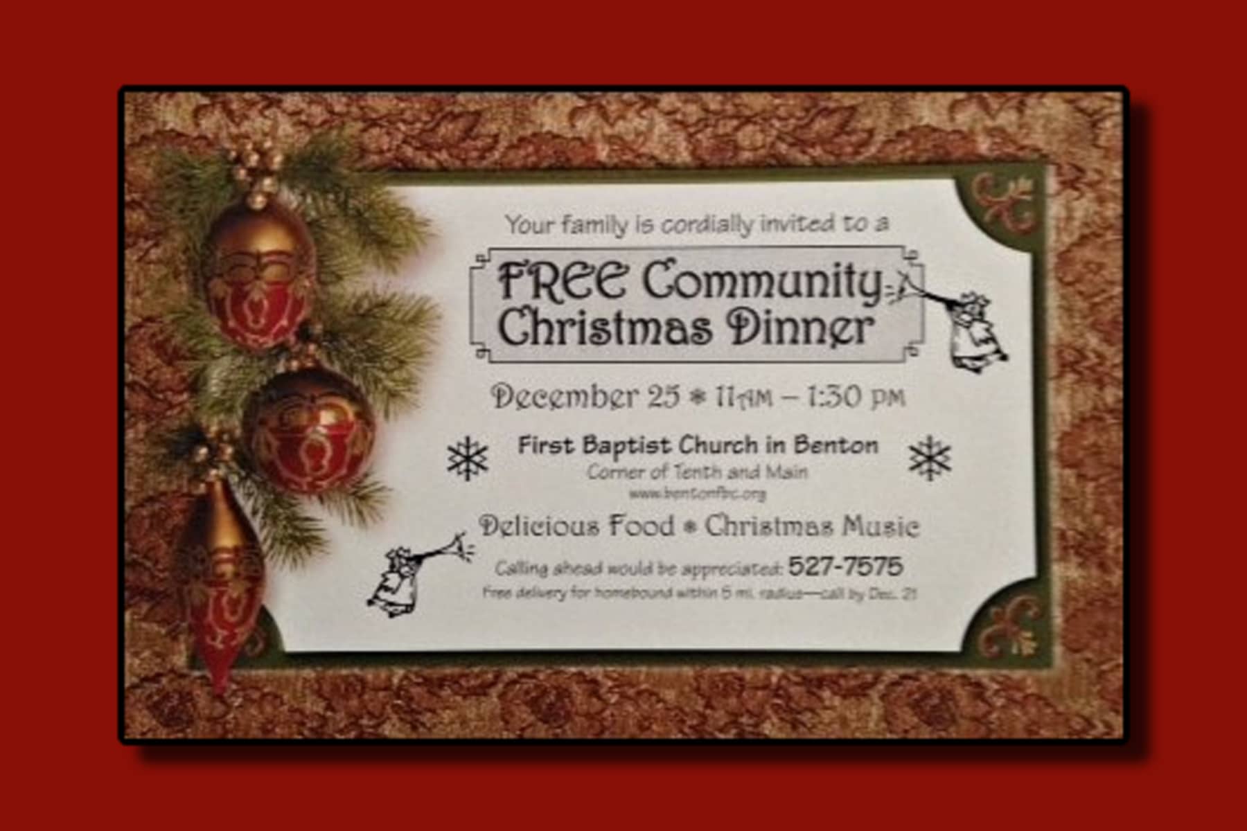 Once again, the First Baptist Church of Benton KY will be opening wide its doors on Christmas Day, offering a FREE Christmas Dinner to the community. This is the 16th year that they have prepared a complete warm holiday meal with all the fixings for those who would like to celebrate this special day with joy and friends and a meal.