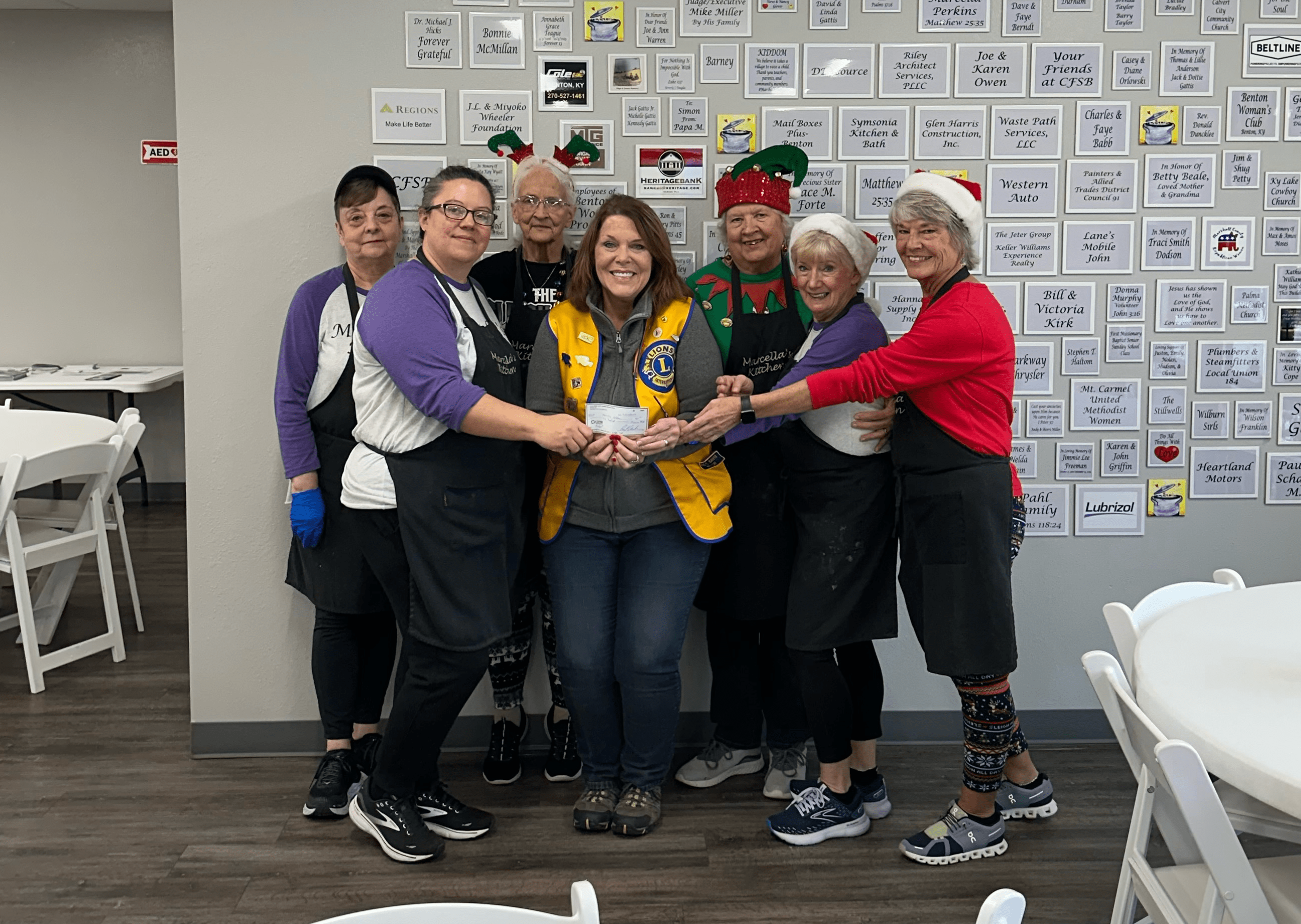 Wendy Elrod, President of the Calvert City Lions Club, presents representatives of Marcella’s Kitchen with a check in support of their operation.