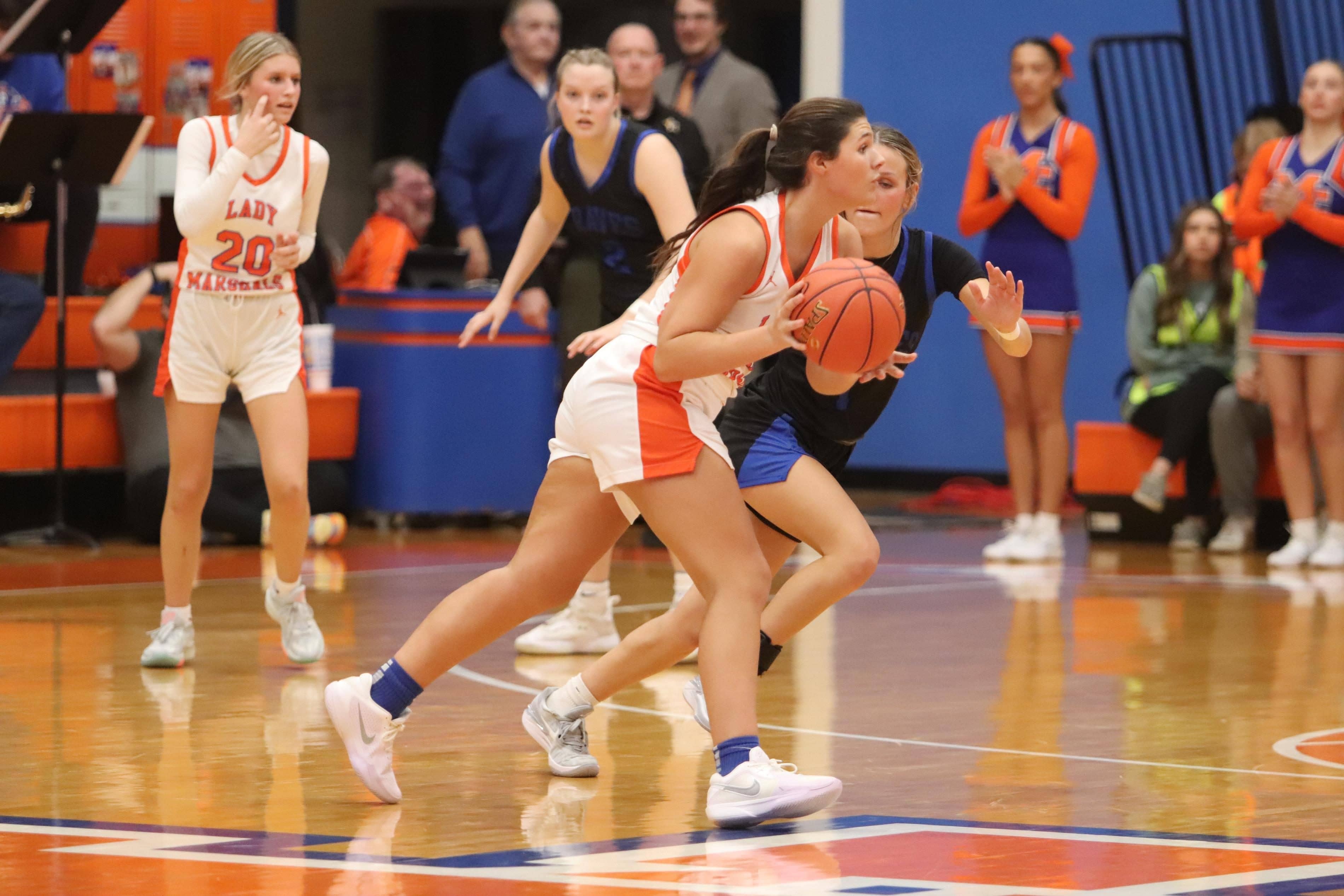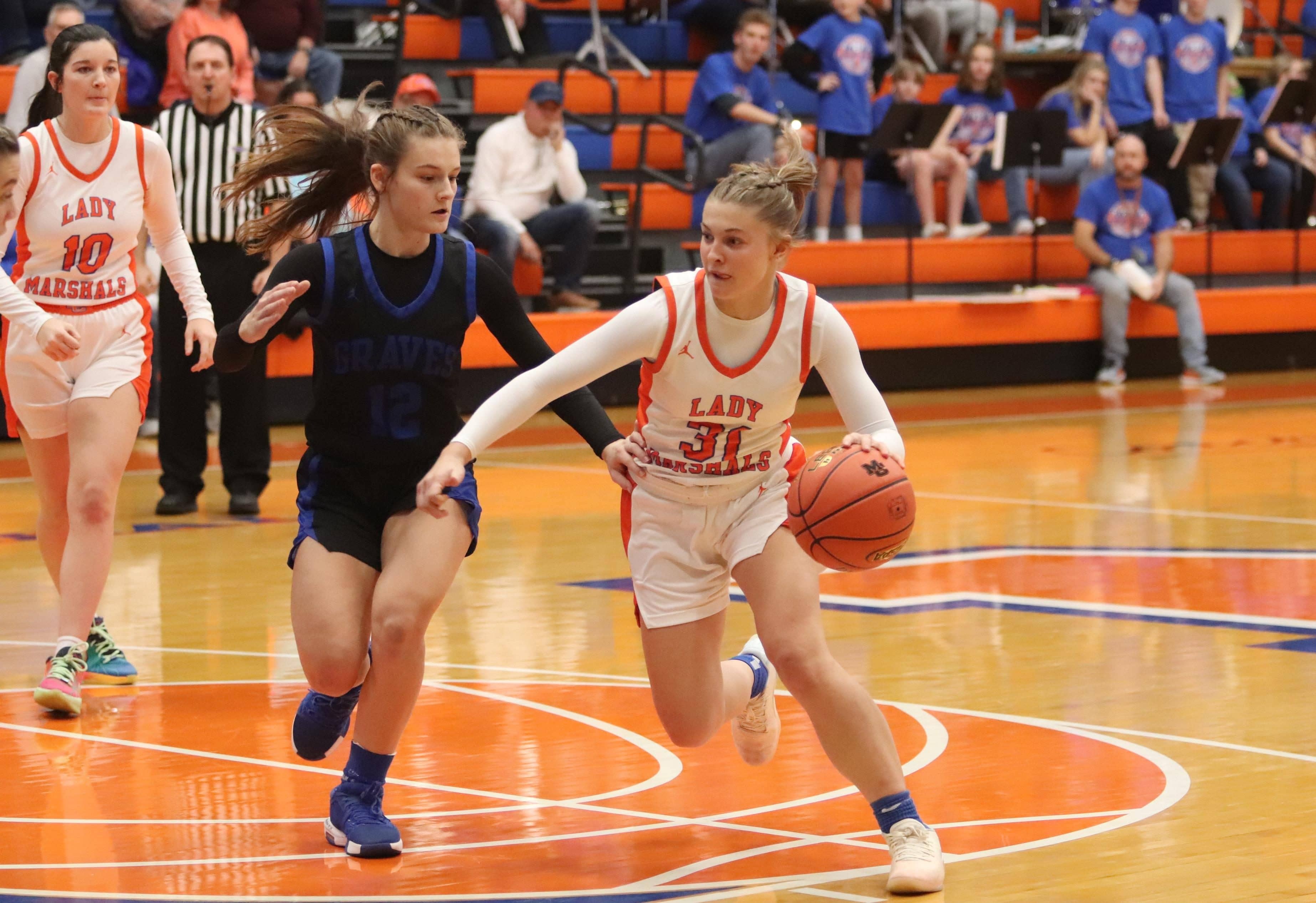 Rylan Darnall broke through with the first made three-pointer of the night for the Lady Marshals in the third quarter and a three from Kenzlee Terry trimmed the Lady Eagles lead down to eight at 29-21.