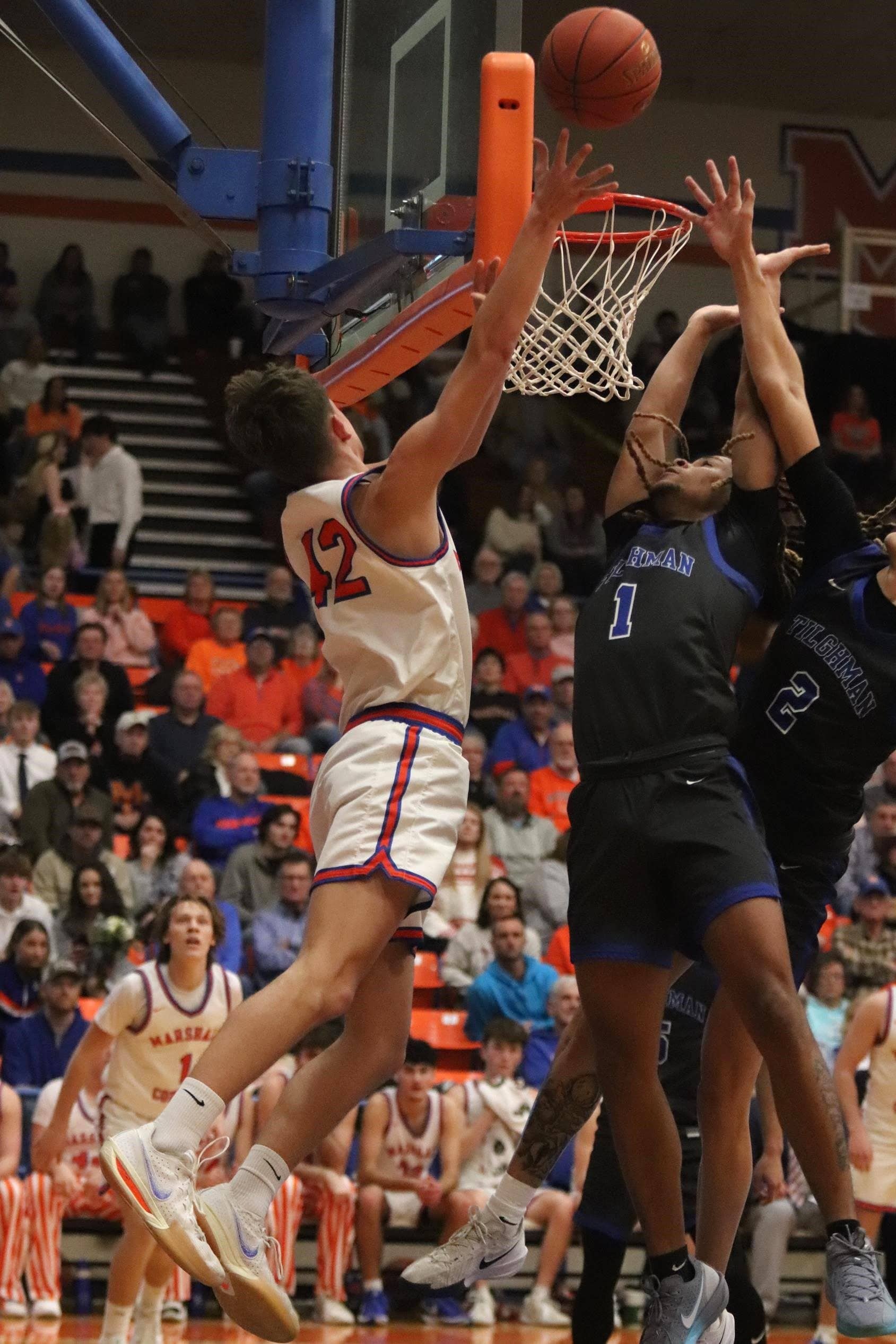 Paducah Tilghman never led in the game but tied Marshall County five times, three of which came late in the third quarter. Each time the Marshals gained an edge, the Blue Tornado came roaring back to close to within one or two points.
