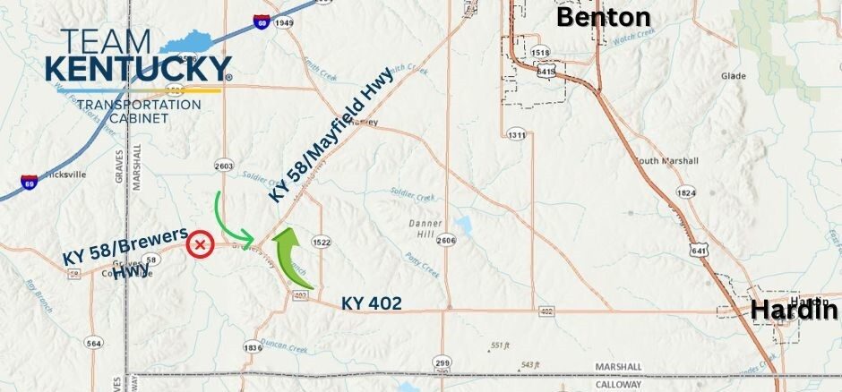 Similarly, westbound motorists from Hardin to Mayfield will need to turn right at the “Y” from KY 402 onto KY 58/Mayfield Highway, heading toward Benton.