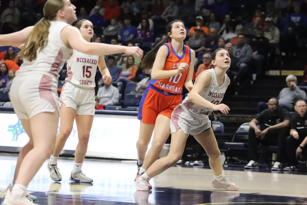 The Lady Marshals jumped out to an 11-3 lead before McCracken County closed the first quarter with two late baskets, cutting the deficit to 11-7.