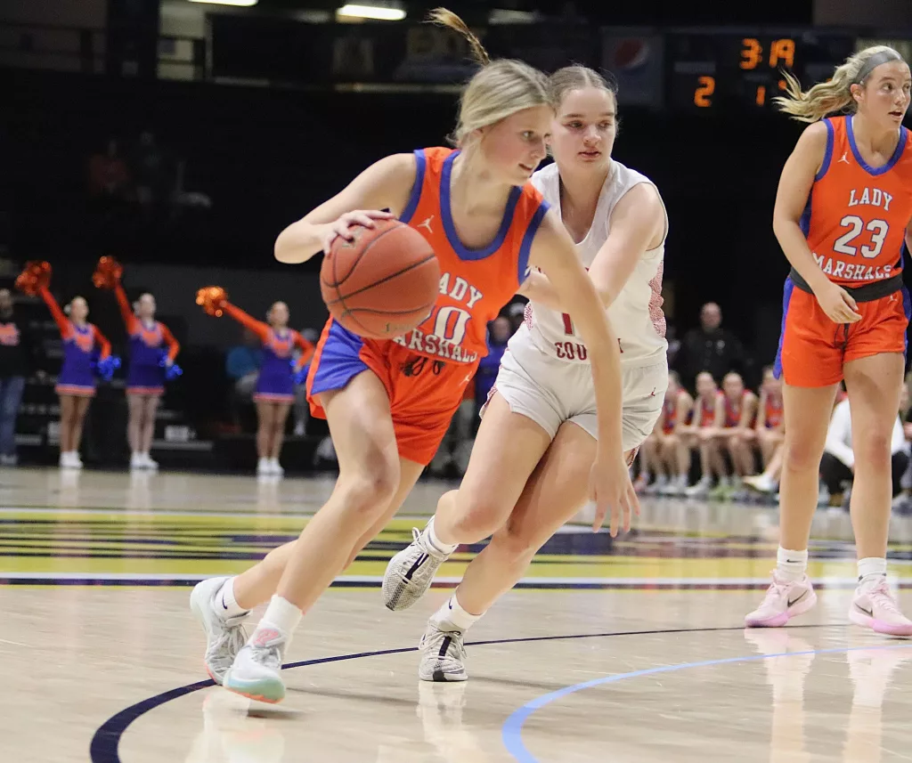 Kenzlee Terry driving down the court for the Lady Marshals, defended by McCracken County’s Abby Casebier (10) in Friday’s Region 1 Tournament semifinal win over McCracken County. Terry scored 10 points, hit two 3-pointers and was selected Player of the Game for her performance.