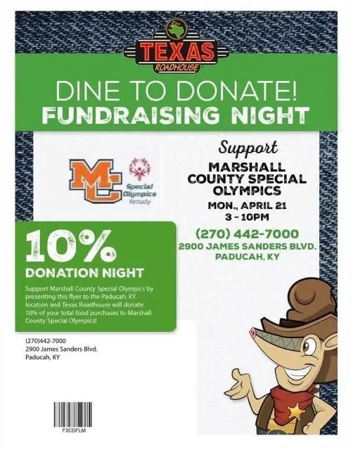 Support Marshall County Special Olympics at their Fundraising Night at Texas Roadhouse on Monday, April 21. Present the above flyer at the Paducah location and Texas Roadhouse will donate 10% of your food purchases to Marshall County Special Olympics.