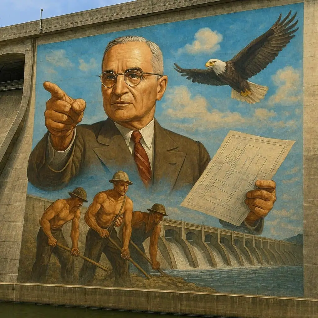 • A 200-foot rendering of President Harry S. Truman, the only sitting president to visit the dam, shown heroically pointing at blueprints while a bald eagle salutes in the background. Truman’s glasses gleam with patriotic intensity, and his tie flutters in a wind that may or may not be symbolic.
