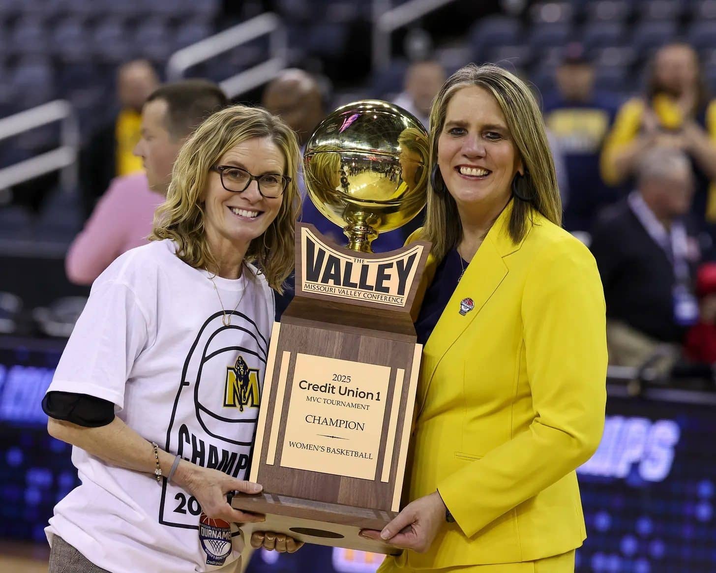 Assistant Coach Monica Evans (left), has coached with Turner for all but one of her seasons both at Murray High School and Murray State with Rechelle Turner holding the 2025 MVC Trophy. Photo: David Eaton/Murray State Athletics