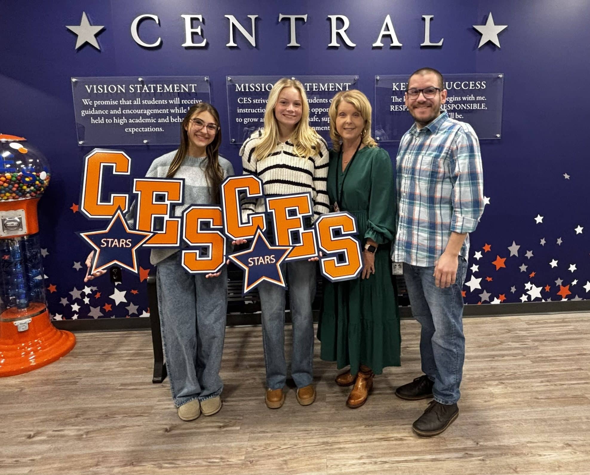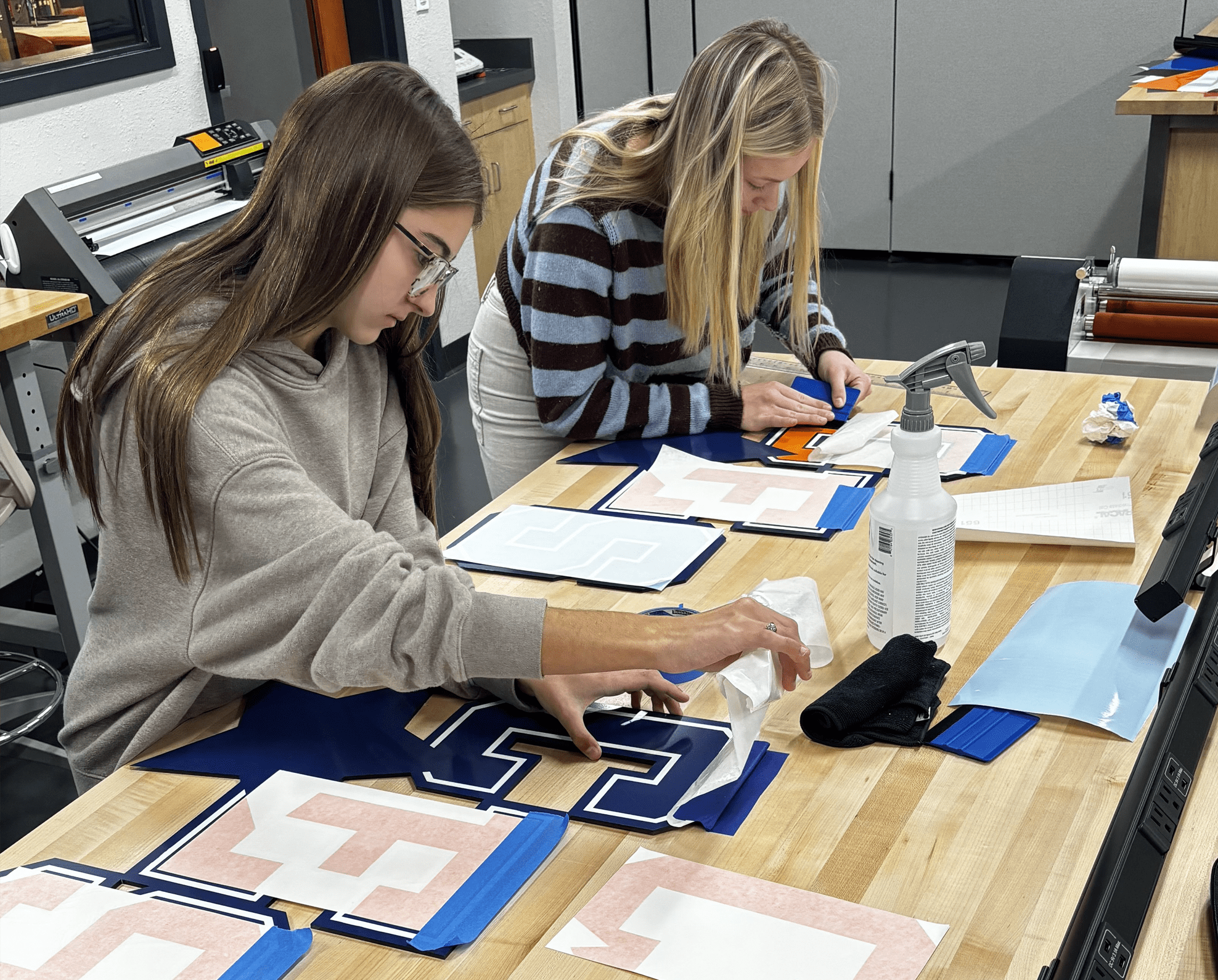 The students began by recreating the Central Elementary logo in vector format using library-provided software. They then operated a CO₂ laser to cut acrylic into the logo’s shape before using a vinyl cutter to apply multiple colored layers, resulting in vibrant, professional-quality signs.