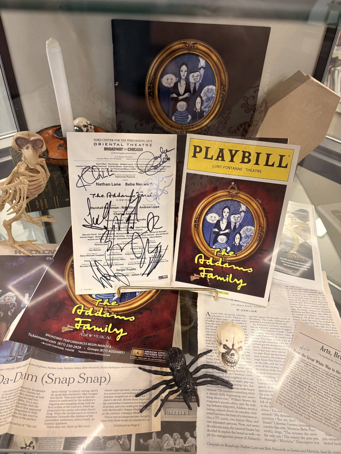 The display includes a souvenir program and a Playbill signed by members of the original Broadway cast, including legendary performers Bebe Neuwirth and Nathan Lane. The items provide a unique connection to the New York debut of the musical and offer a rare opportunity for local residents to see authentic Broadway collectibles up close.