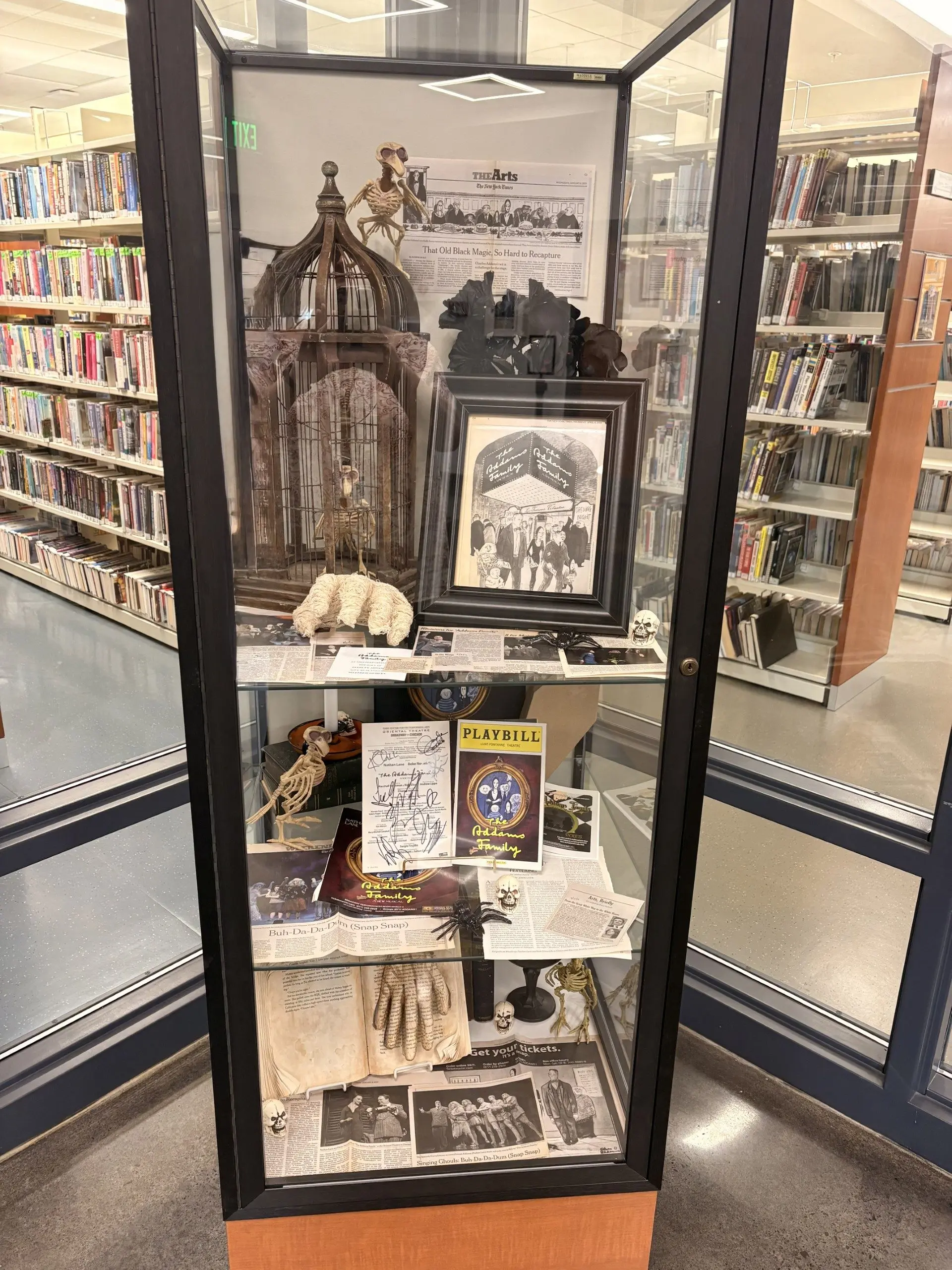 (BENTON, Ky.) — Visitors to the Benton branch of the Marshall County Public Library can now get a glimpse of Broadway history thanks to a special display in the library’s lobby featuring memorabilia from the original Broadway run of The Addams Family Musical.